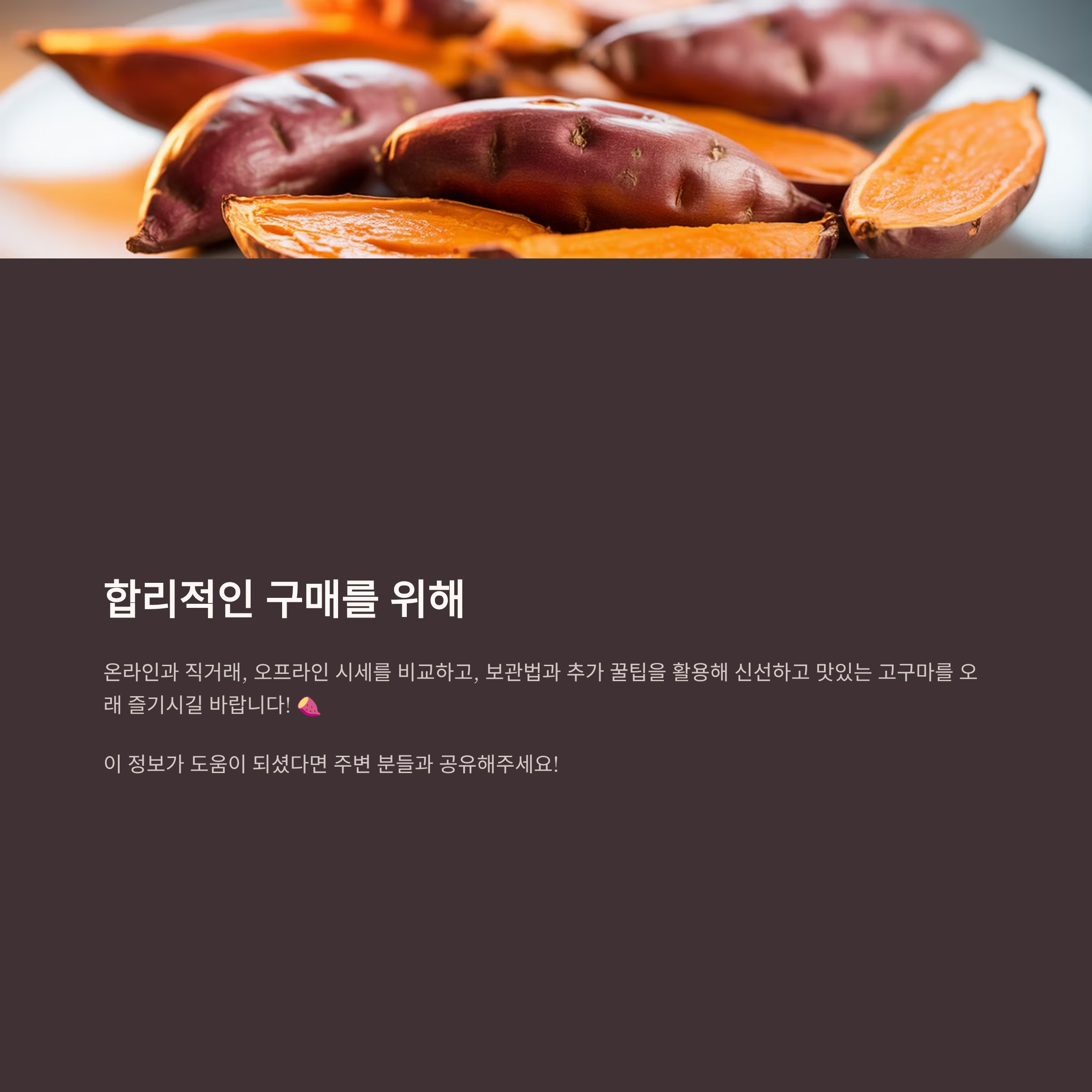 합리적인 구매를 위해 온라인과 직거래, 오프라인 시세를 비교하고, 보관법과 추가 꿀팁을 활용해 신선하고 맛있는 고구마를 오래 즐기시길 바랍니다.