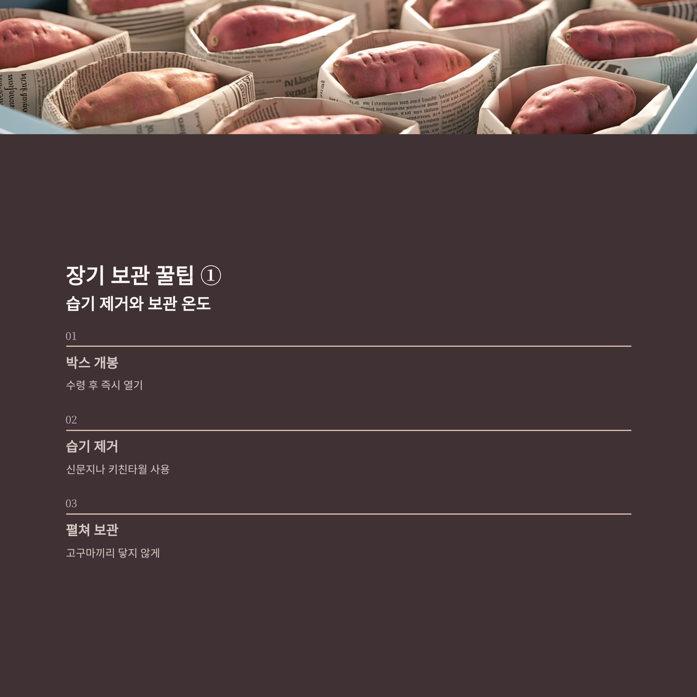 수령 후 곧바로 박스를 열어 신문지나 키친타월로 습기를 제거하고, 고구마끼리 닿지 않도록 겹치지 않게 펼쳐 보관합니다.