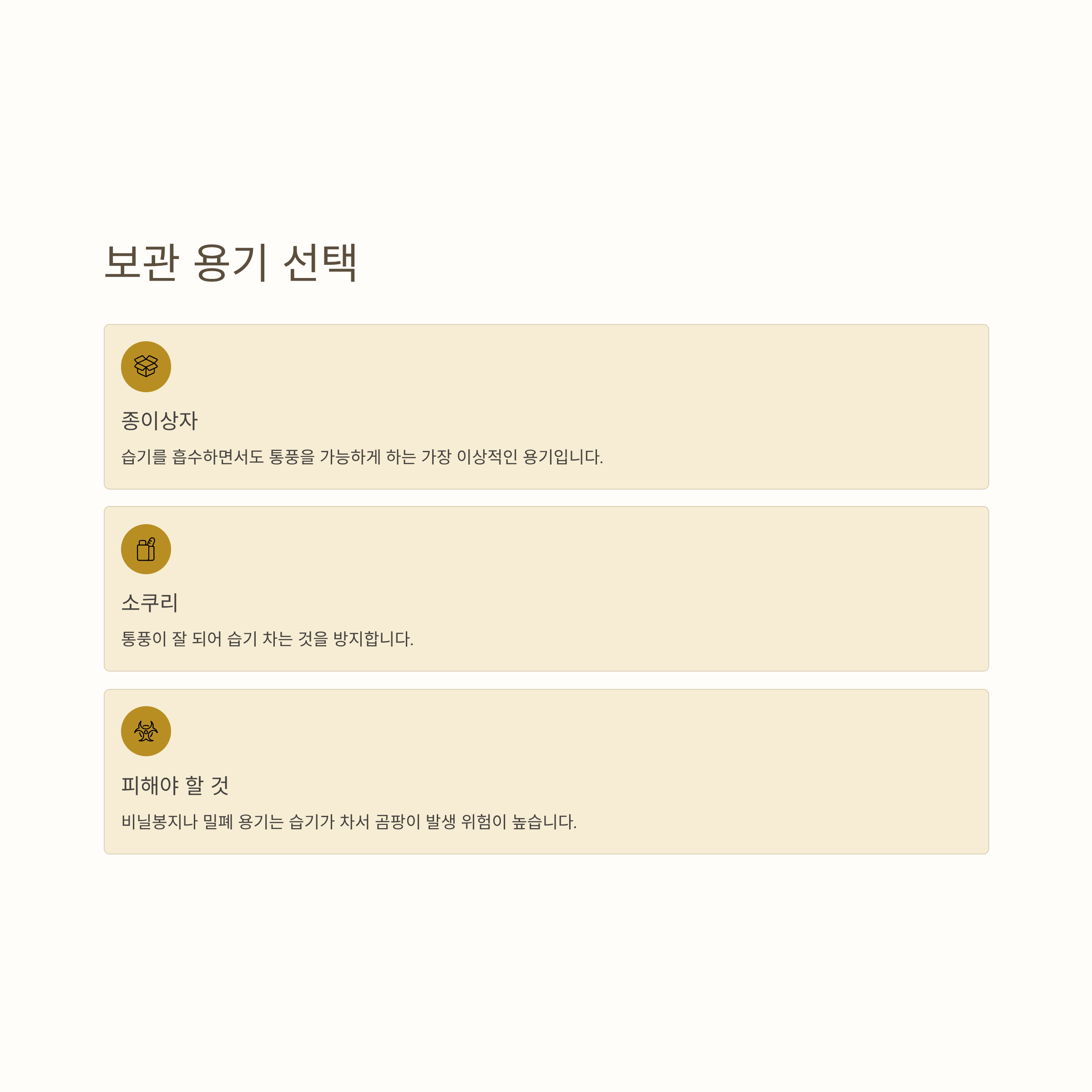 특히 종이상자는 적당히 습기를 흡수하면서도 통풍을 가능하게 하므로 가장 이상적입니다.