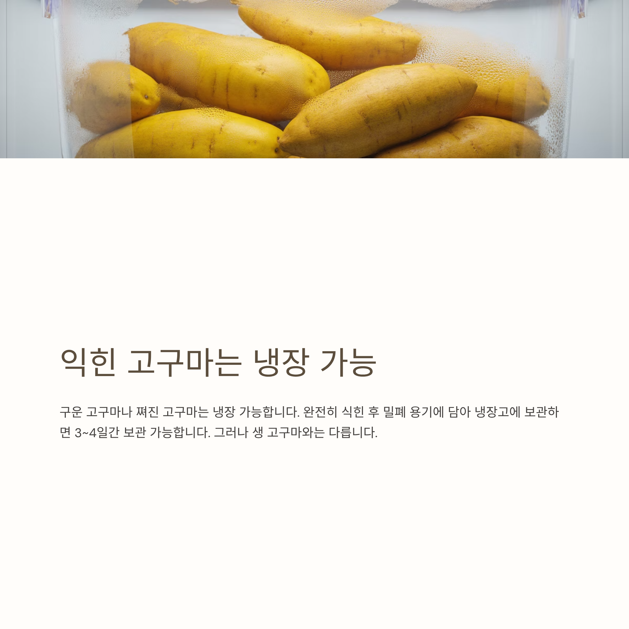 구운 고구마나 쪄진 고구마는 냉장 가능합니다. 완전히 식힌 후 밀폐 용기에 담아 냉장고에 보관하면 3~4일간 보관 가능합니다.