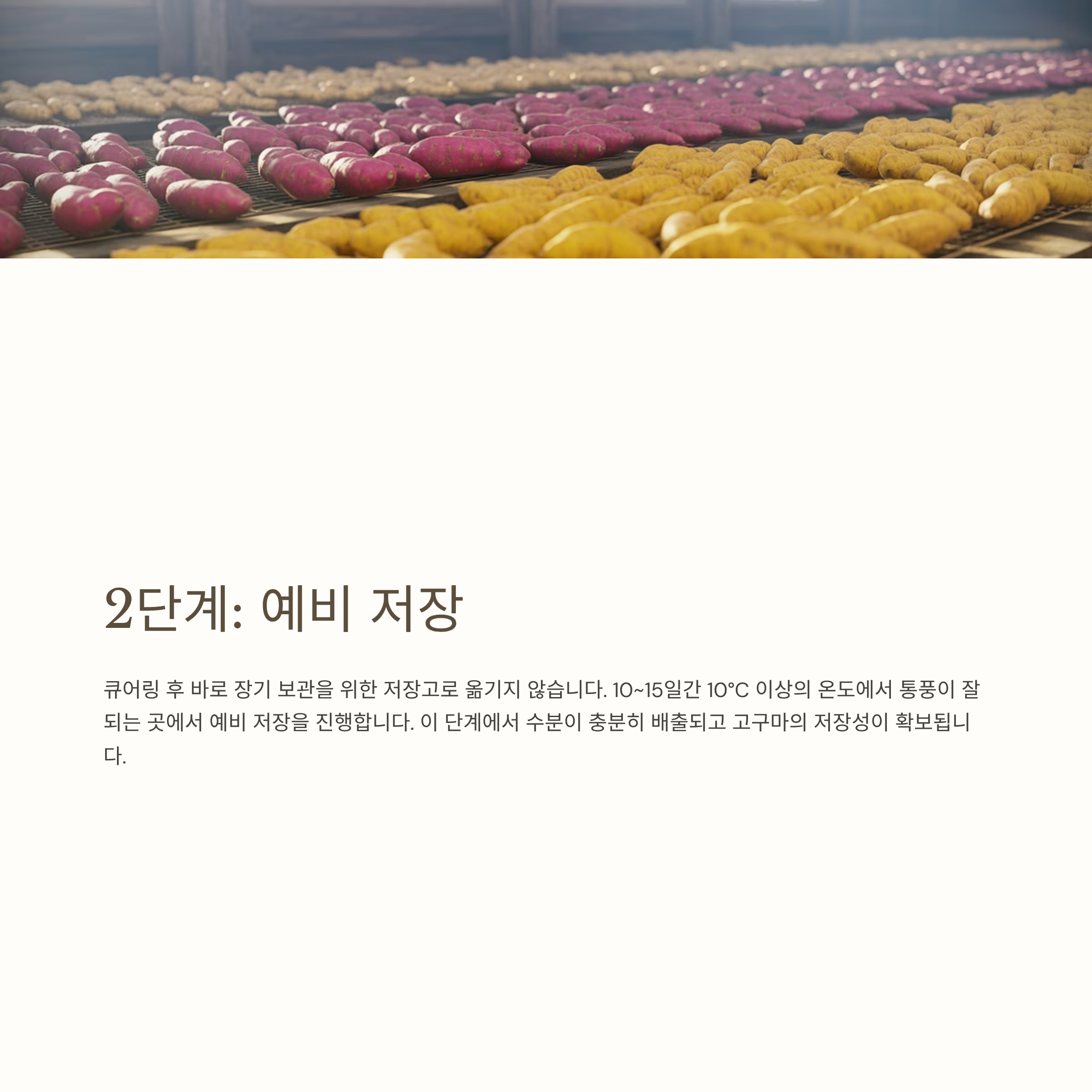 이 단계에서 수분이 충분히 배출되고 고구마의 저장성이 확보됩니다.