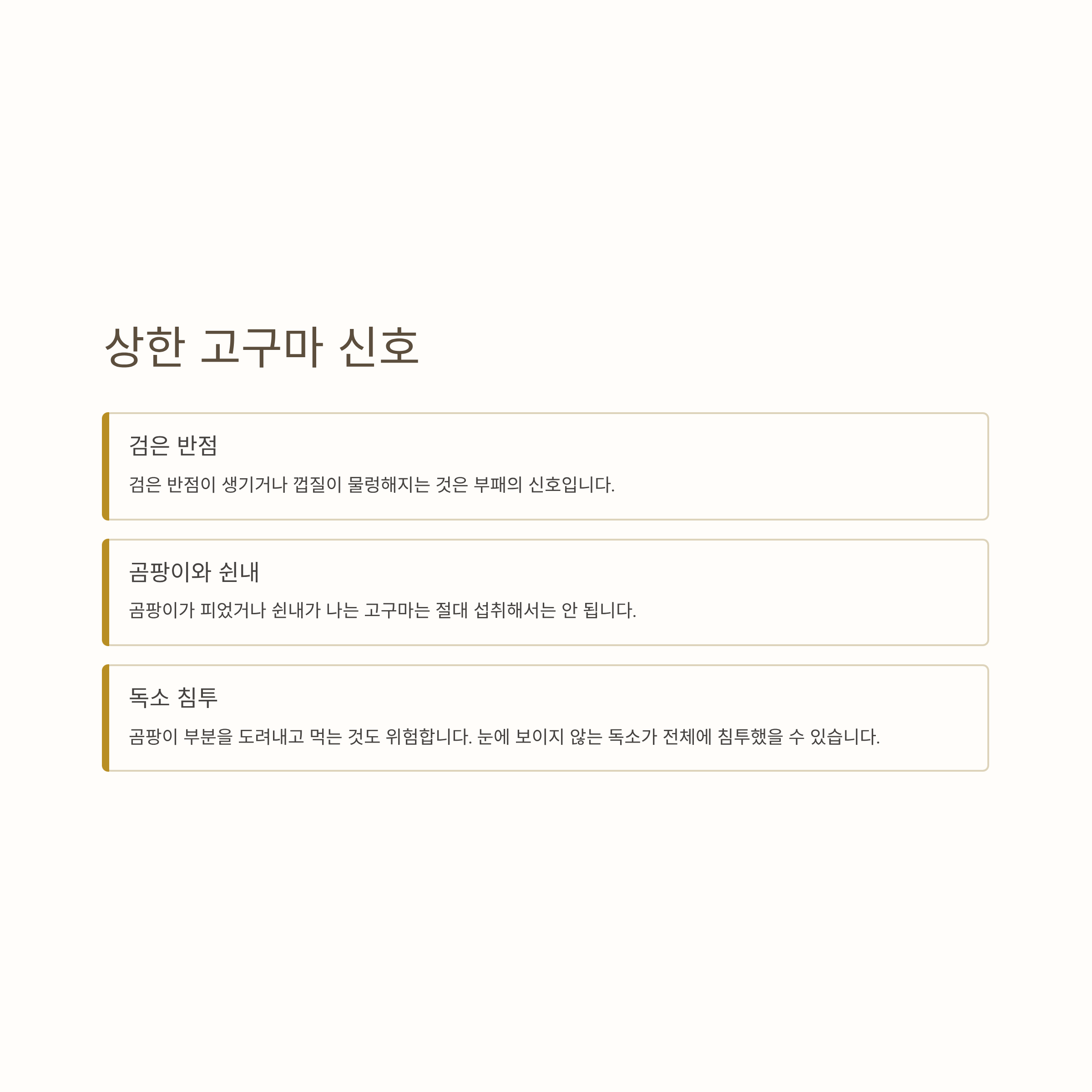 곰팡이가 피었거나 쉰내가 나는 고구마는 절대 섭취해서는 안 됩니다.