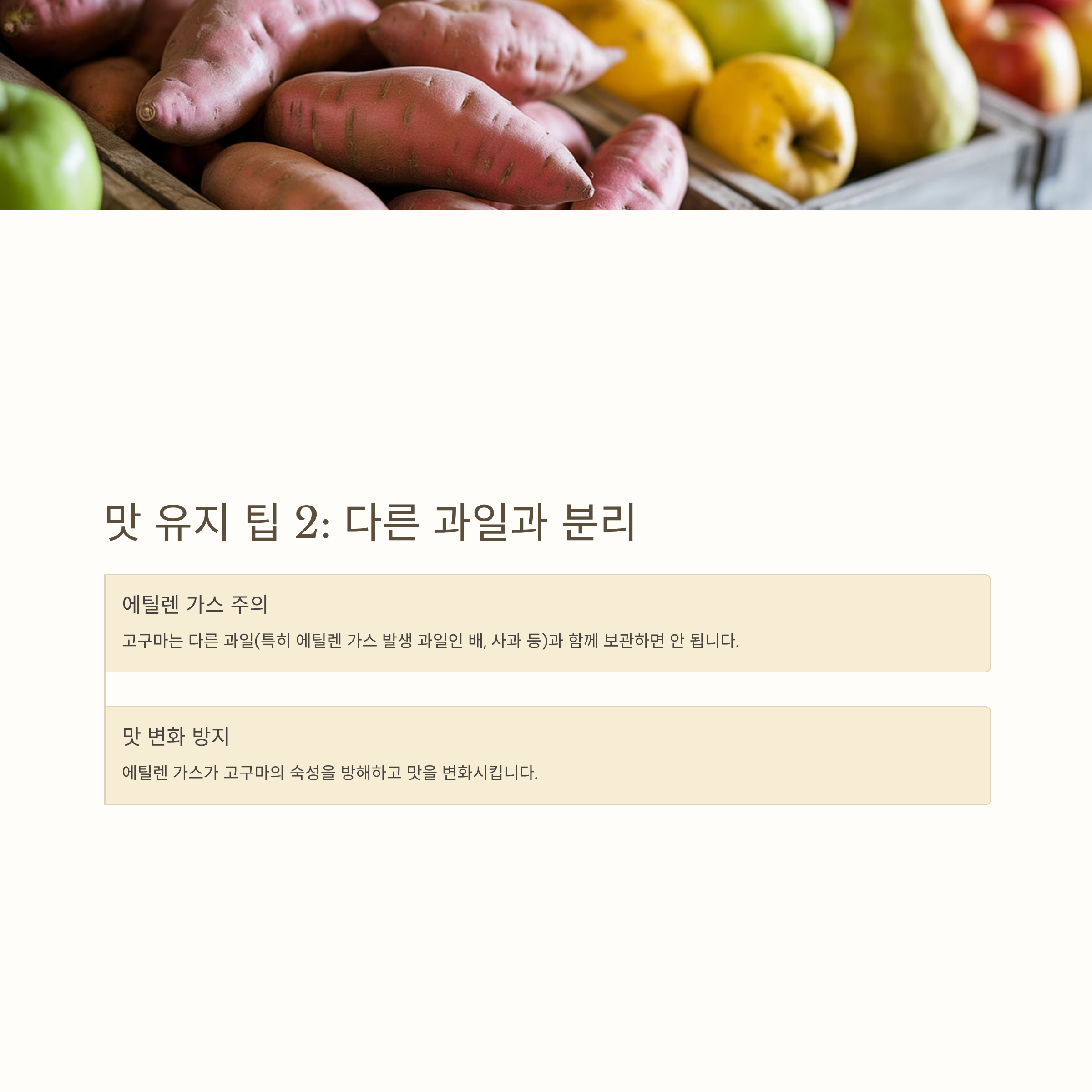 고구마는 다른 과일(특히 에틸렌 가스 발생 과일인 배, 사과 등)과 함께 보관하면 안 됩니다.