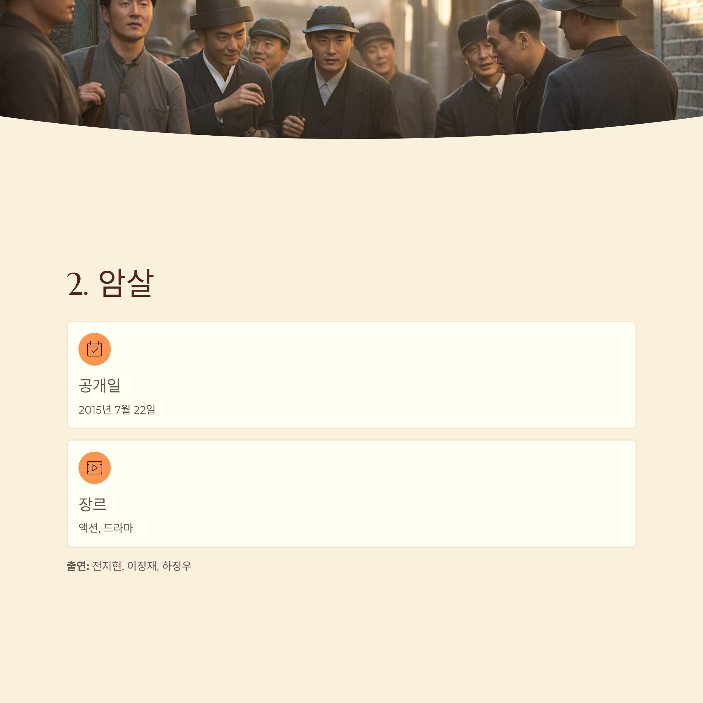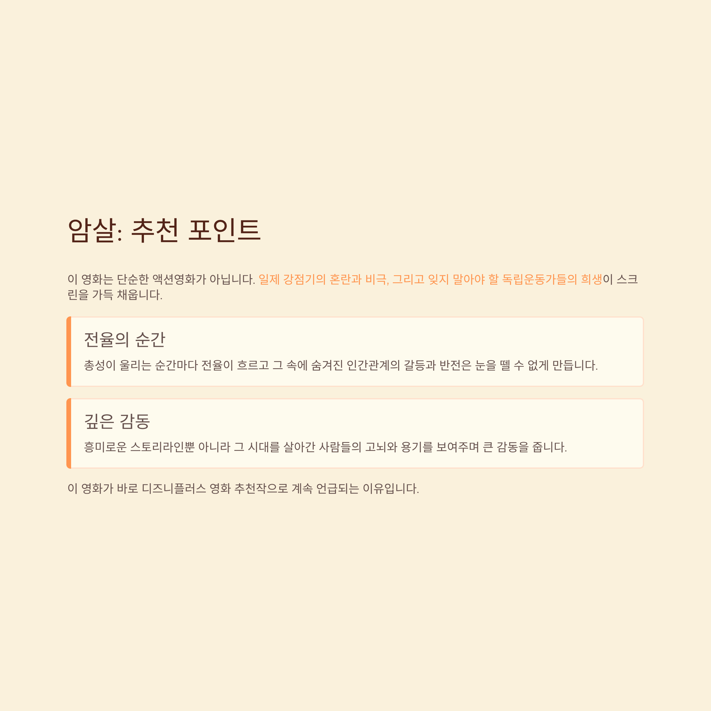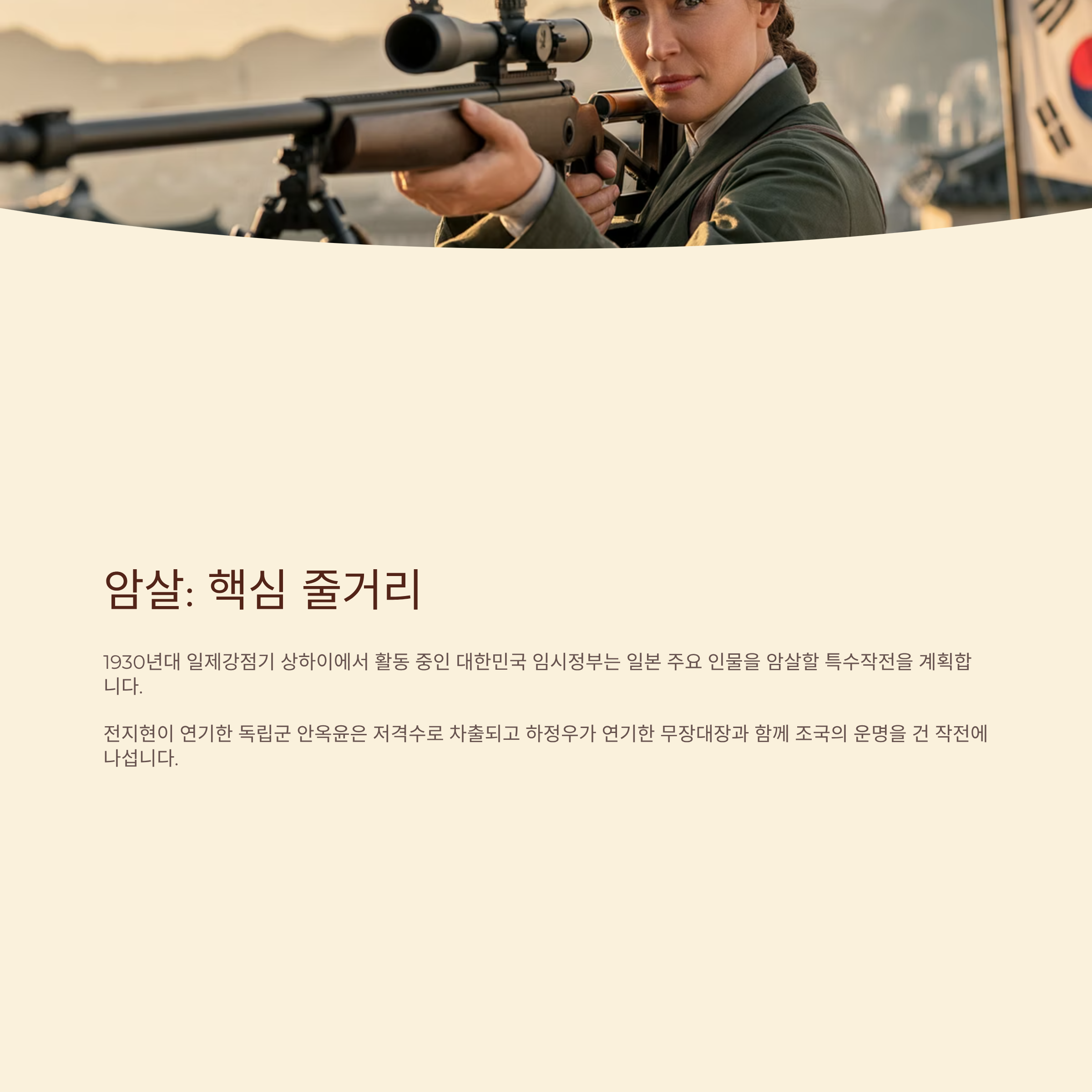 암살은 흥미로운 스토리라인뿐 아니라 그 시대를 살아간 사람들의 고뇌와 용기를 보여주며 큰 감동을 줍니다.