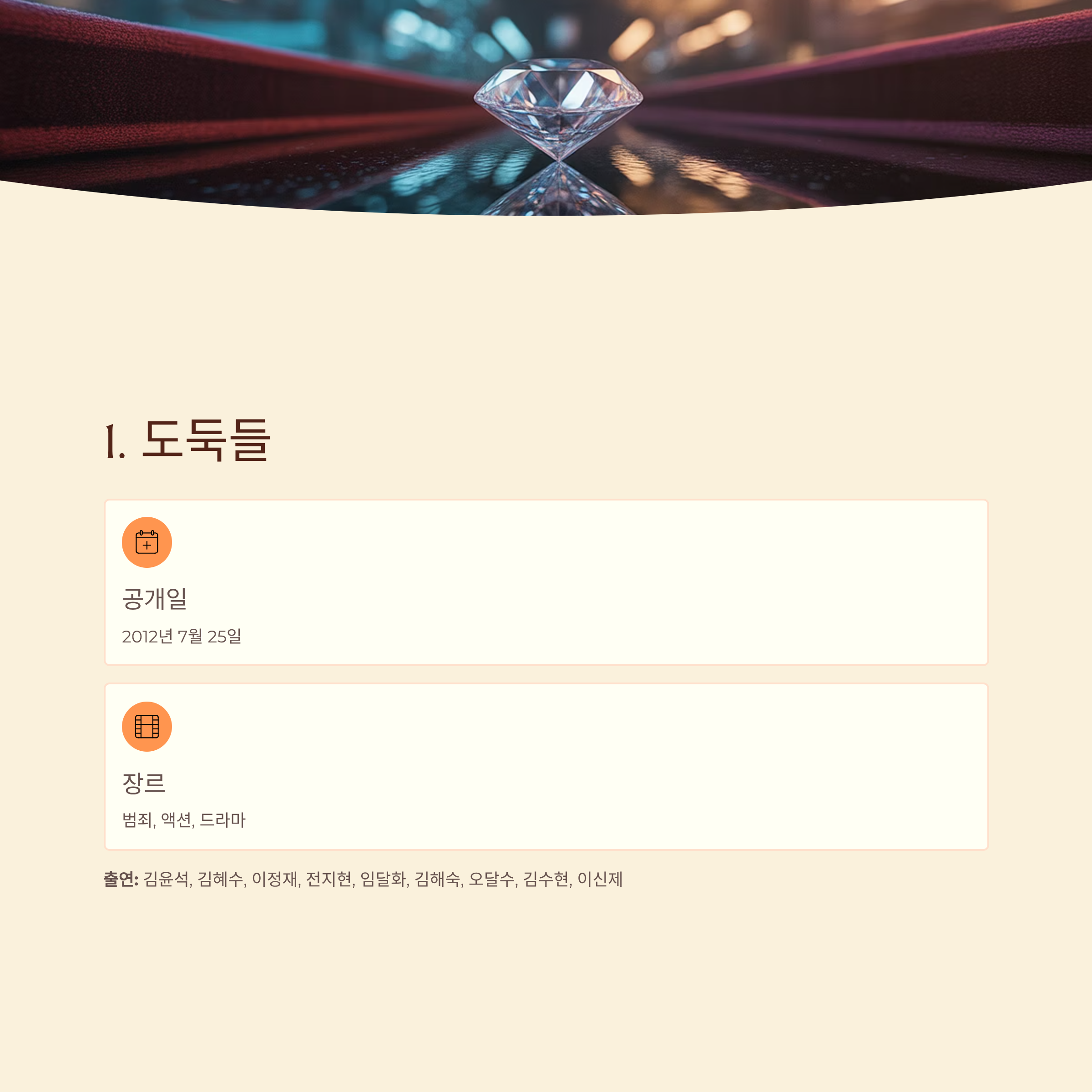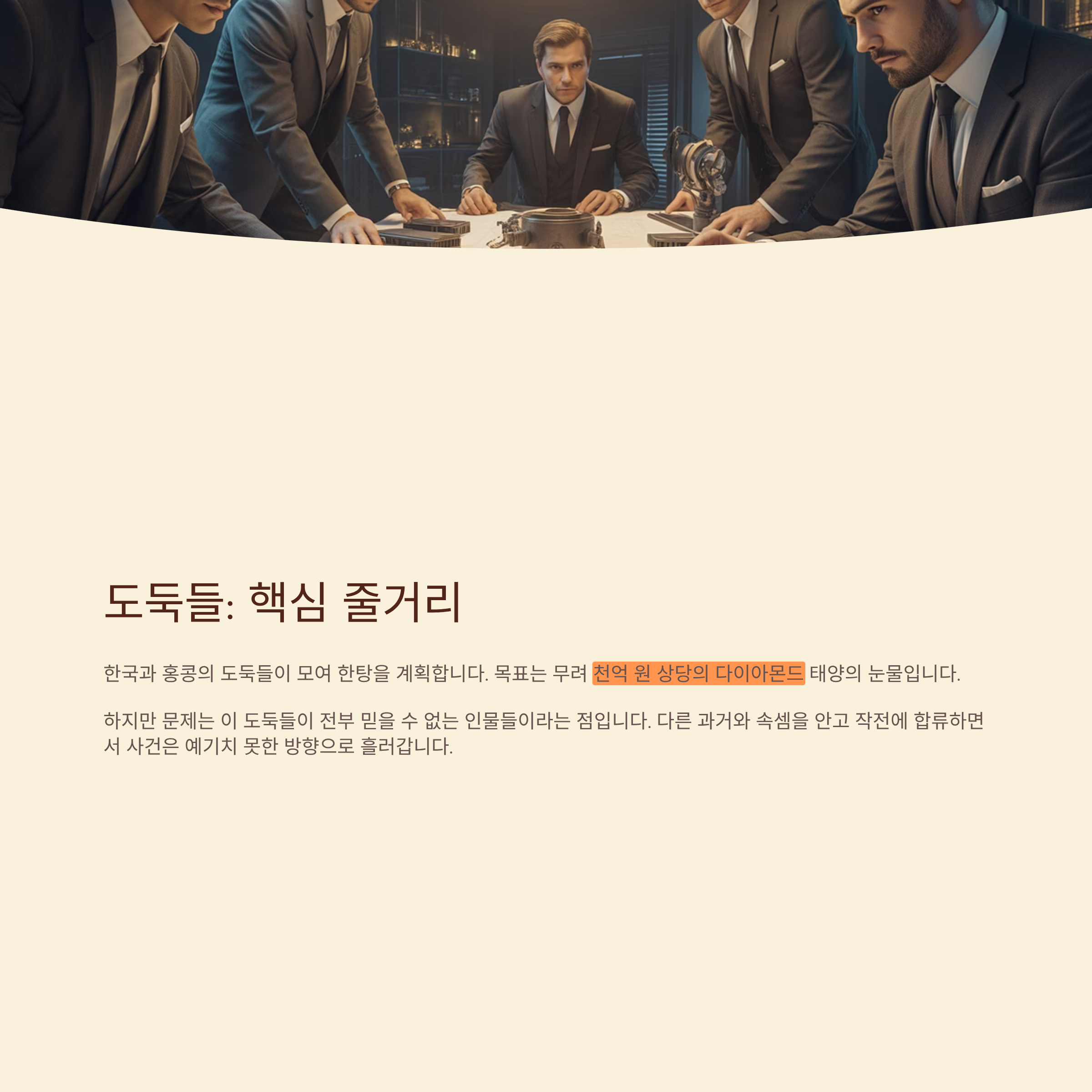 한국과 홍콩의 도둑들이 모여 한탕을 계획합니다. 목표는 무려 천억 원 상당의 다이아몬드 태양의 눈물입니다.