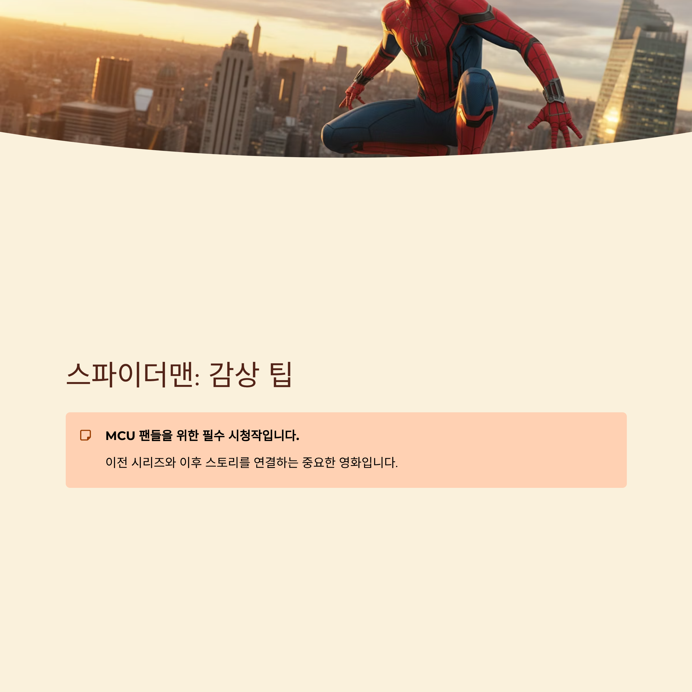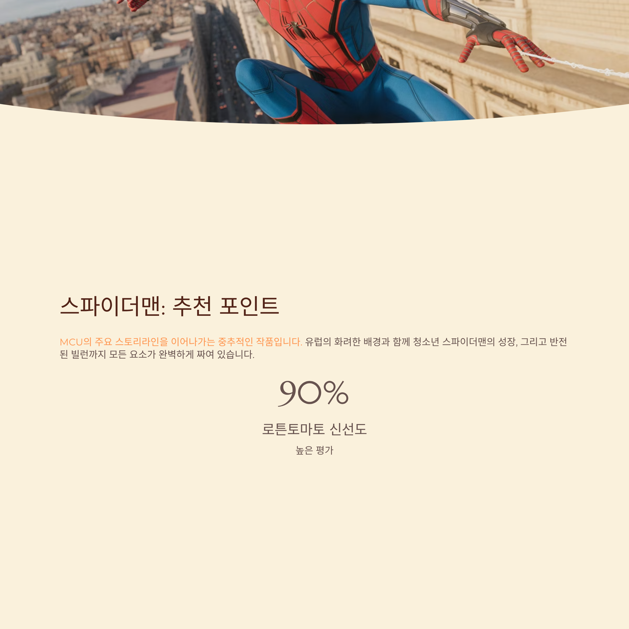 MCU의 주요 스토리라인을 이어나가는 중추적인 작품입니다. 유럽의 화려한 배경과 함께 청소년 스파이더맨의 성장, 그리고 반전된 빌런까지 모든 요소가 완벽하게 짜여 있습니다.