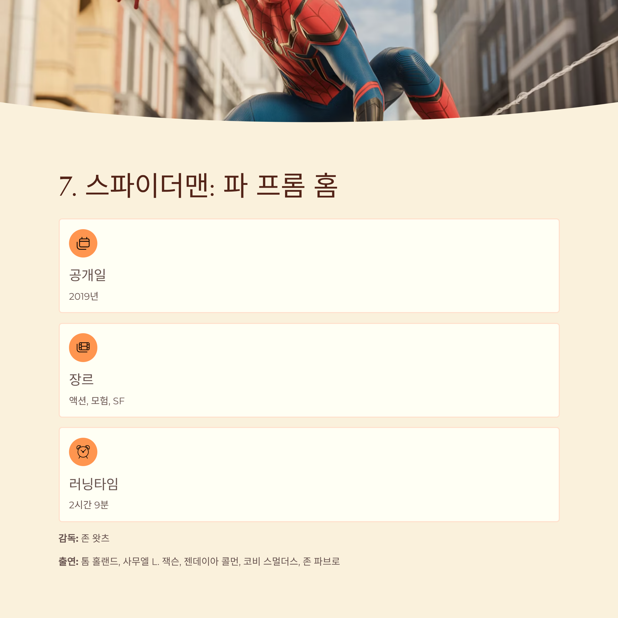 공개일: 2019년 | 장르: 액션, 모험, SF | 감독: 존 왓츠 | 출연: 톰 홀랜드, 사무엘 L. 잭슨, 젠데이아 콜먼, 코비 스멀더스, 존 파브로 | 러닝타임: 2시간 9분