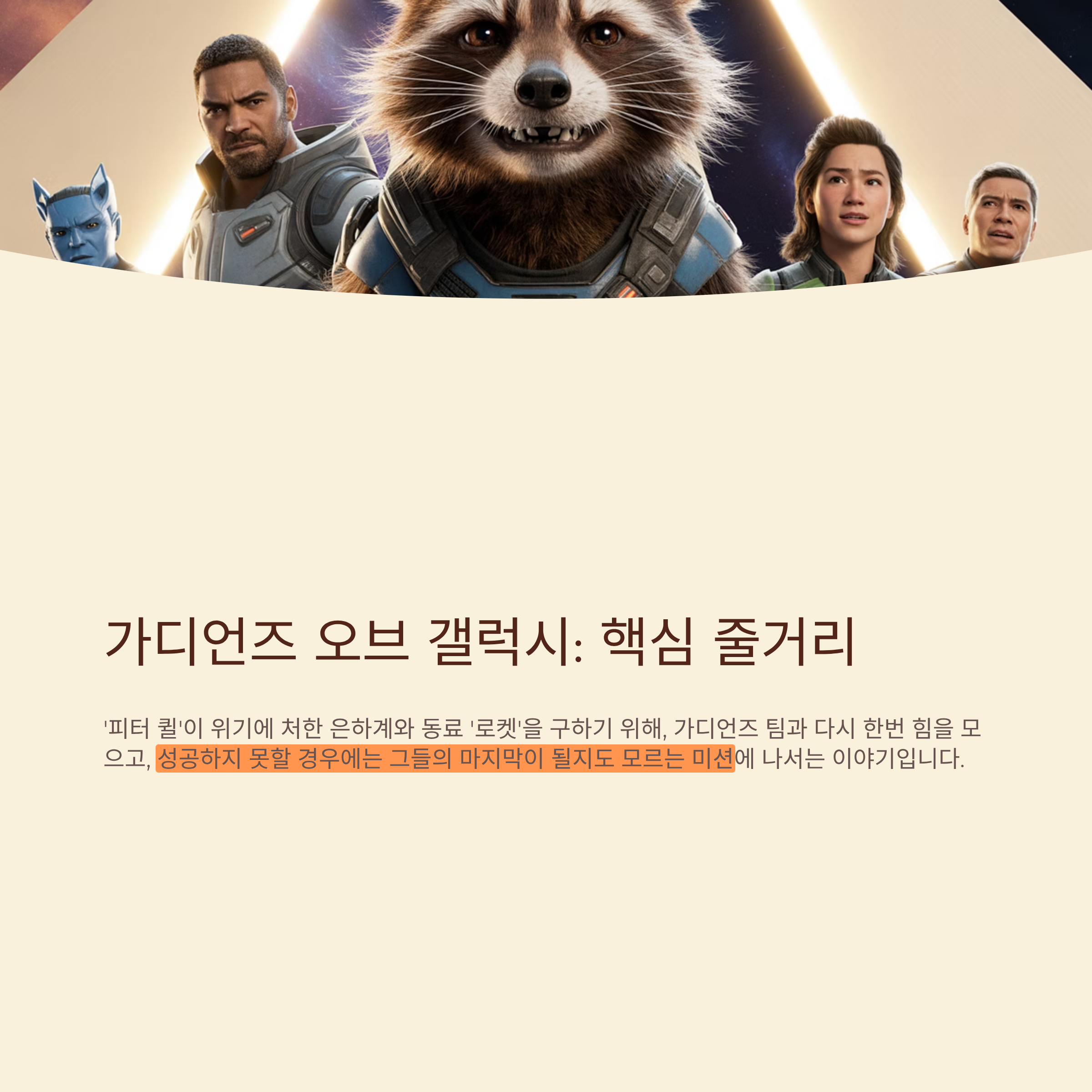 '피터 퀼'이 위기에 처한 은하계와 동료 '로켓'을 구하기 위해, 가디언즈 팀과 다시 한번 힘을 모으고, 성공하지 못할 경우에는 그들의 마지막이 될지도 모르는 미션에 나서는 이야기입니다.