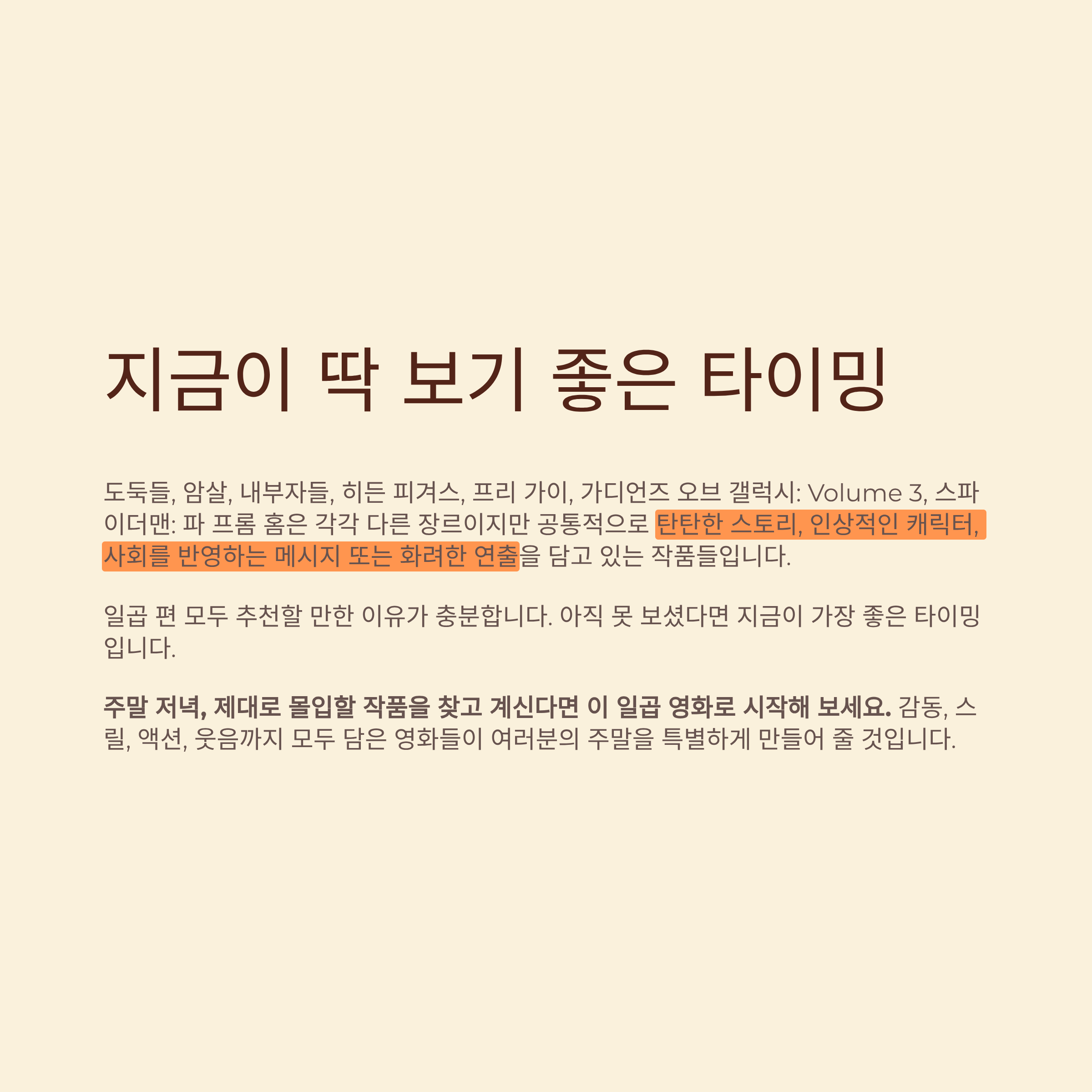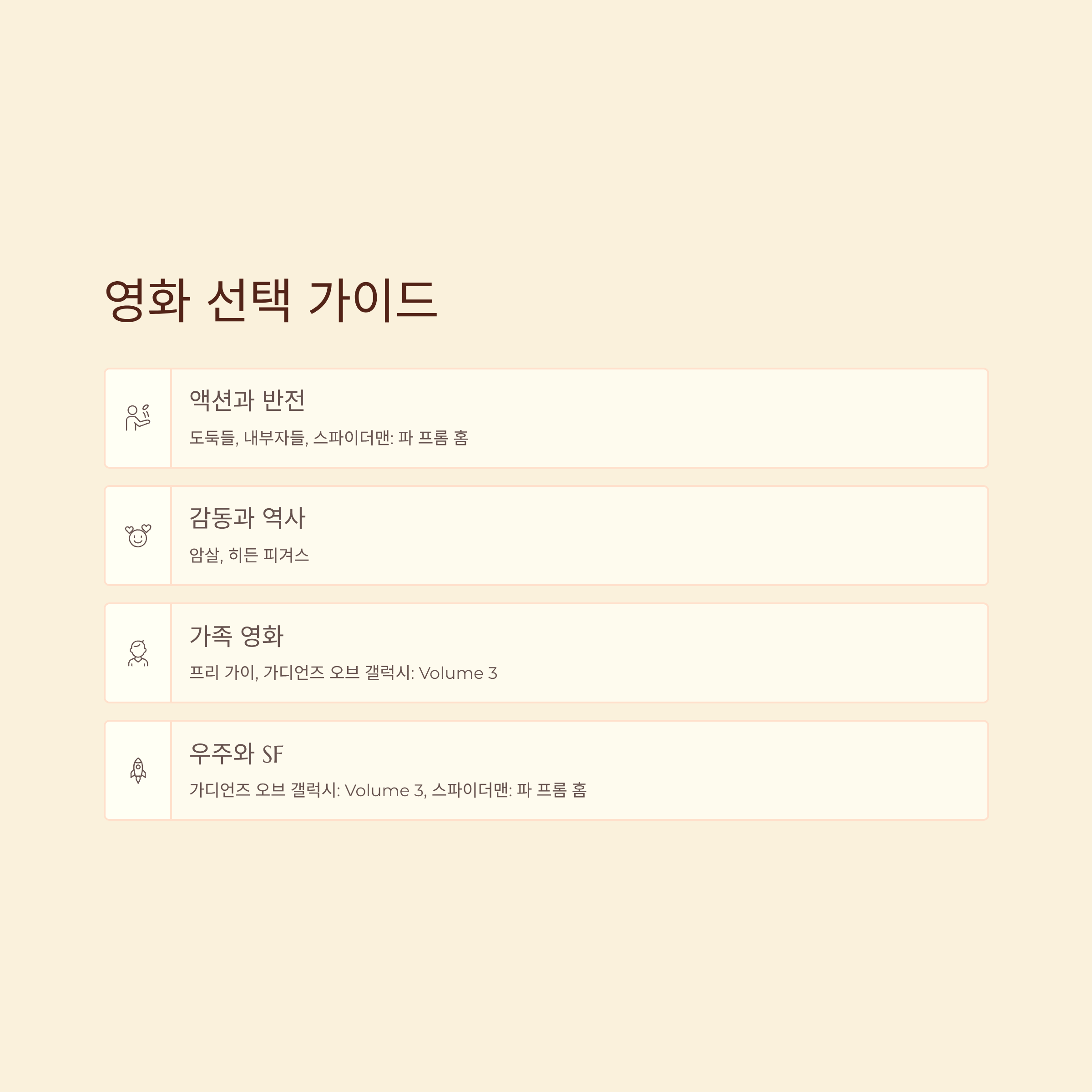 도둑들, 암살, 내부자들, 히든 피겨스, 프리 가이, 가디언즈 오브 갤럭시: Volume 3, 스파이더맨: 파 프롬 홈은 각각 다른 장르이지만 공통적으로 탄탄한 스토리, 인상적인 캐릭터, 사회를 반영하는 메시지 또는 화려한 연출을 담고 있는 작품들입니다.