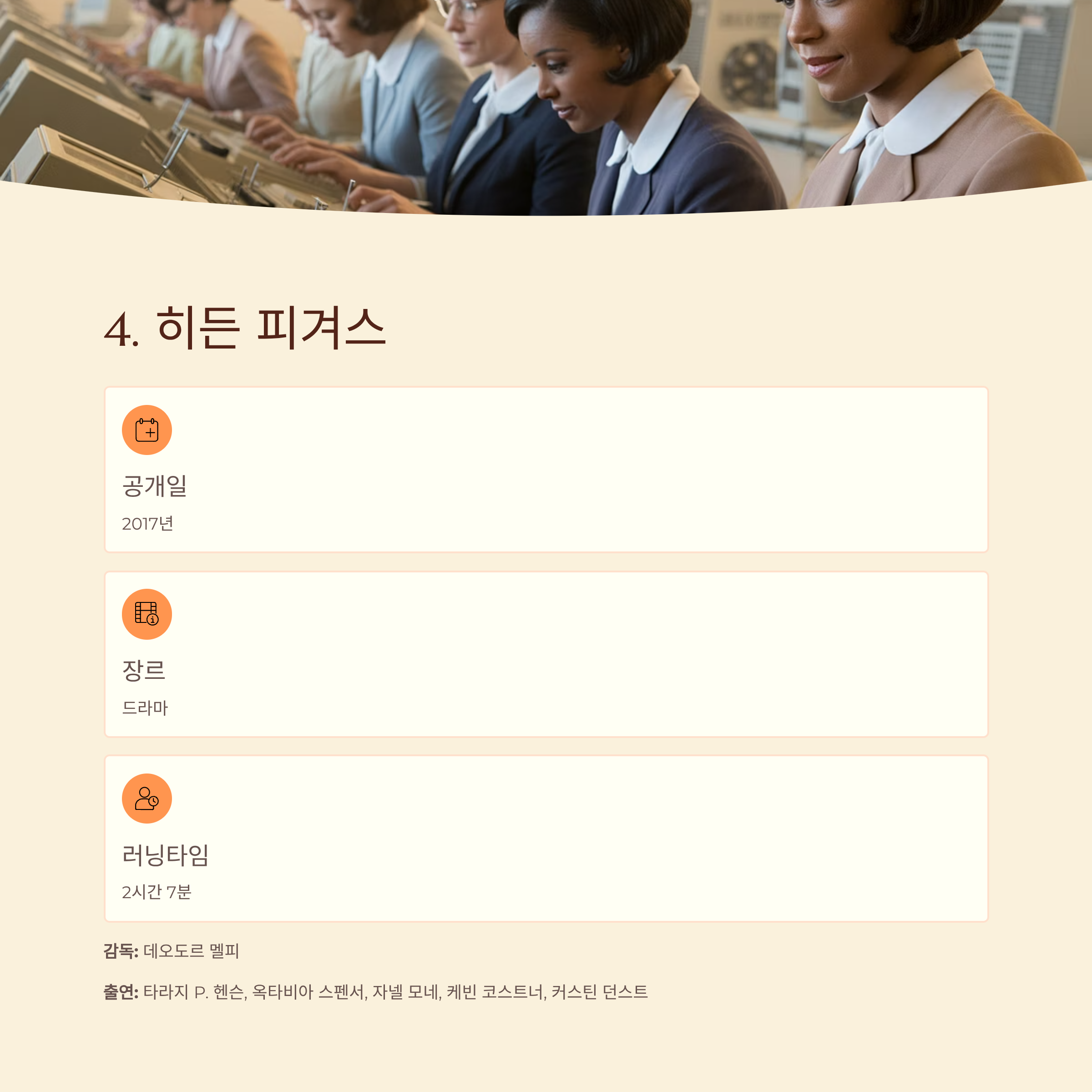 공개일: 2017년 | 장르: 드라마 | 감독: 데오도르 멜피 | 출연: 타라지 P. 헨슨, 옥타비아 스펜서, 자넬 모네, 케빈 코스트너, 커스틴 던스트 | 러닝타임: 2시간 7분