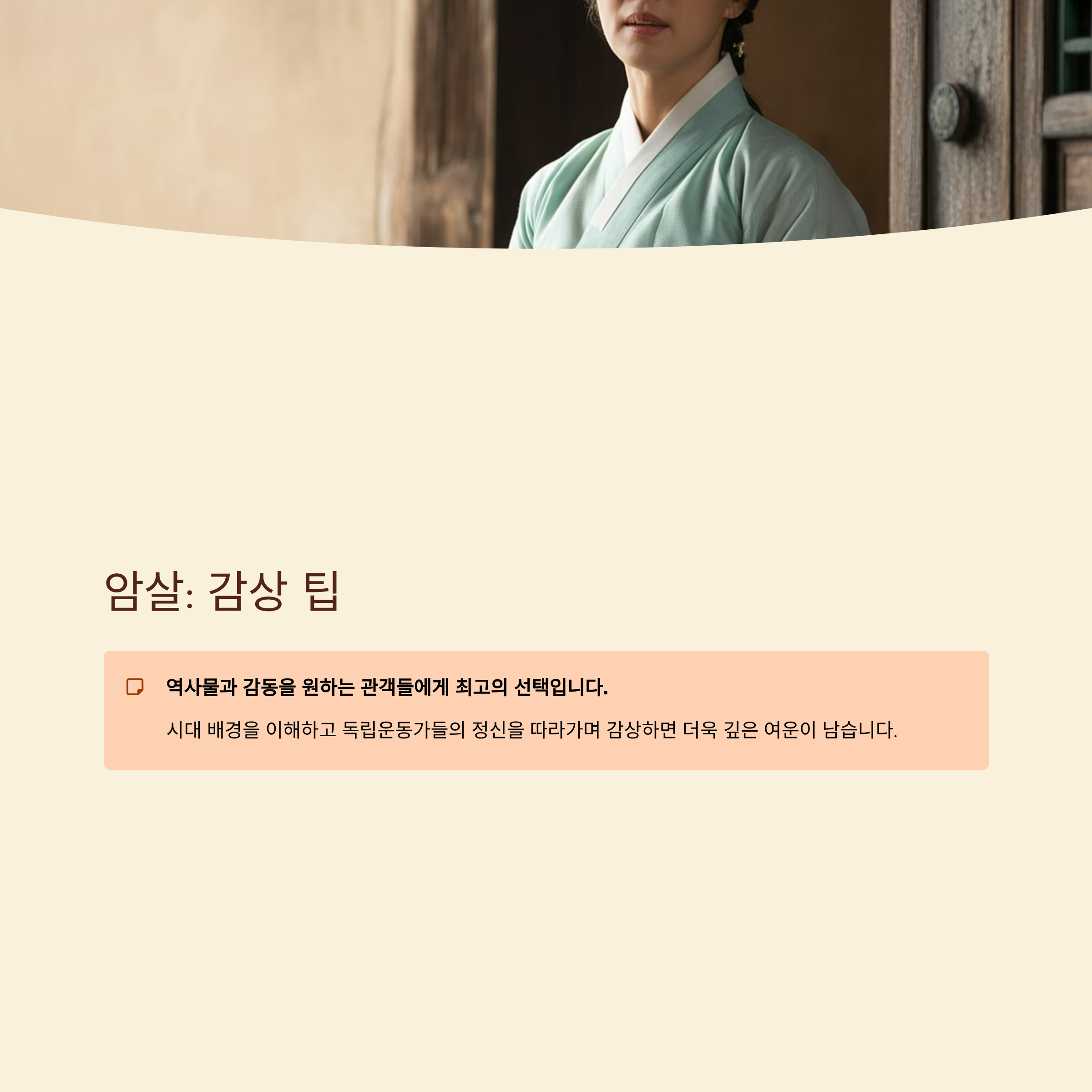 시대 배경을 이해하고 독립운동가들의 정신을 따라가며 감상하면 더욱 깊은 여운이 남습니다.