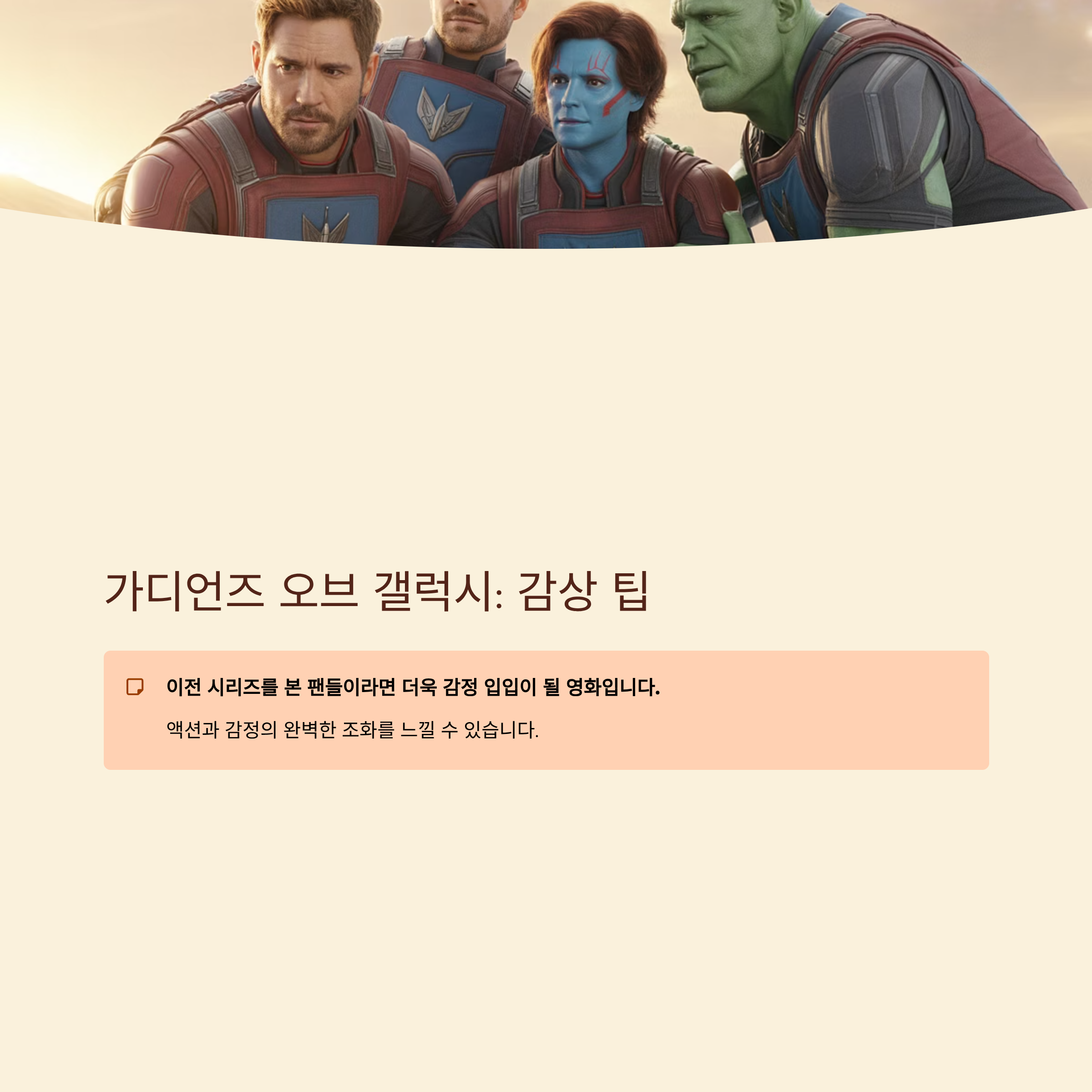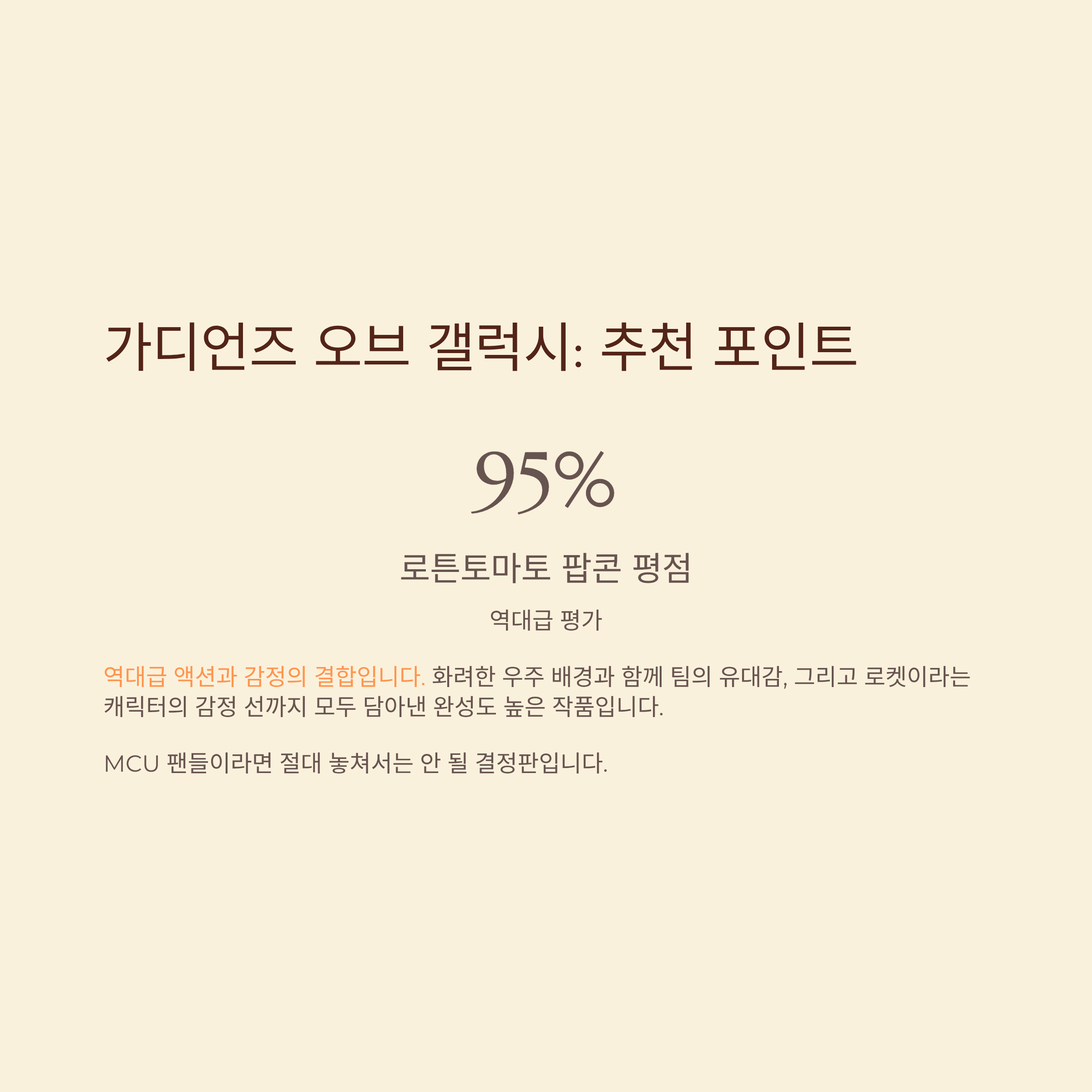로튼토마토 팝콘 평점 95%로 평가받는 역대급 액션과 감정의 결합입니다. 화려한 우주 배경과 함께 팀의 유대감, 그리고 로켓이라는 캐릭터의 감정 선까지 모두 담아낸 완성도 높은 작품입니다.