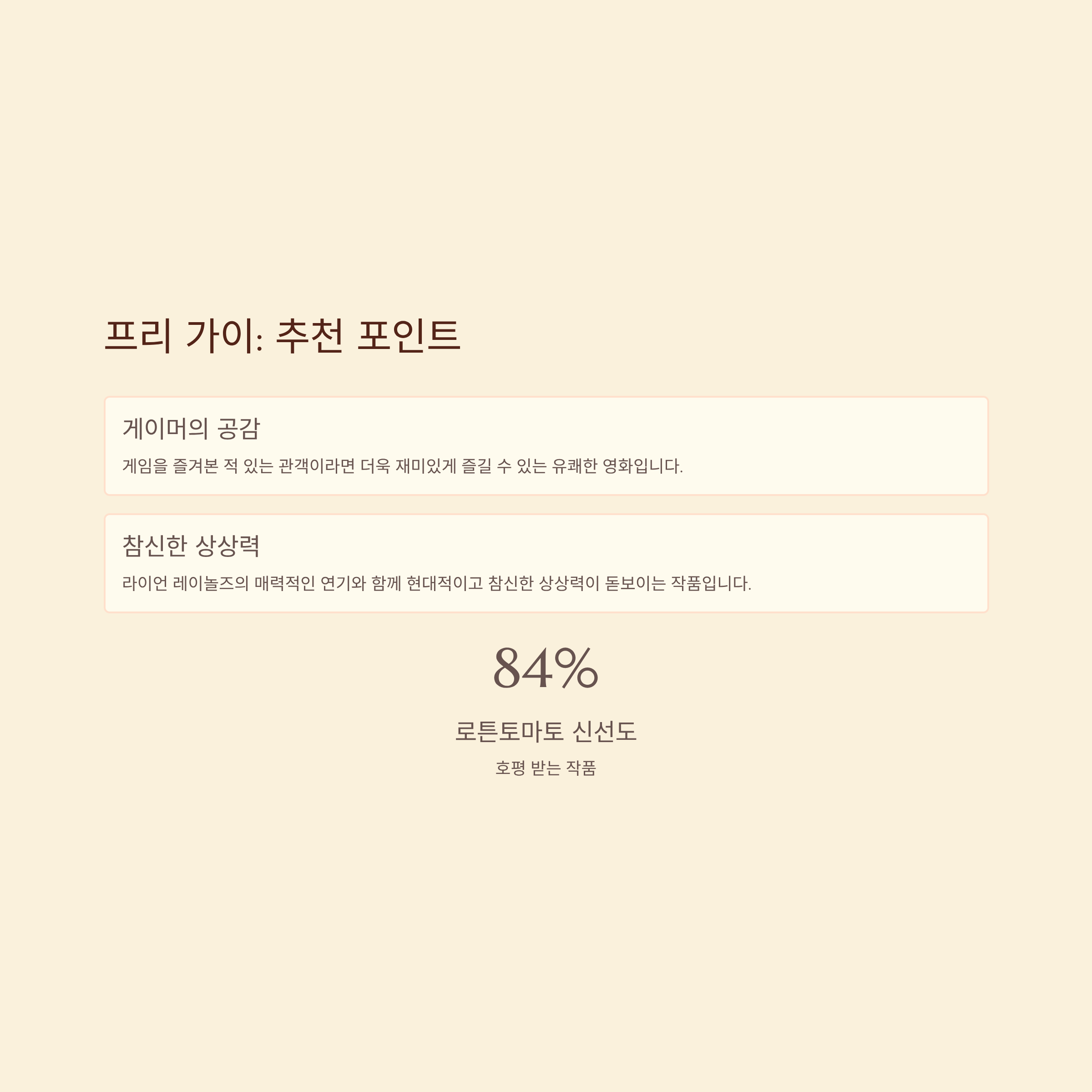 게임을 즐겨본 적 있는 관객이라면 더욱 재미있게 즐길 수 있는 유쾌한 영화입니다.
