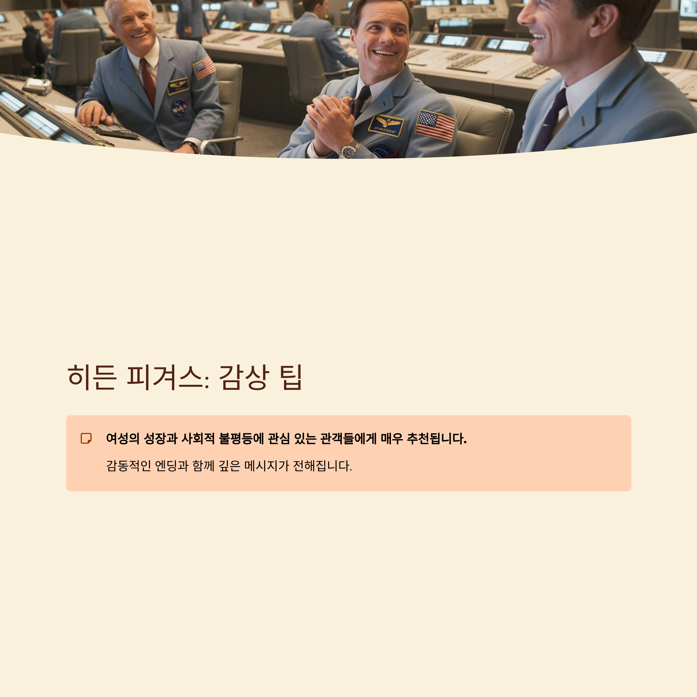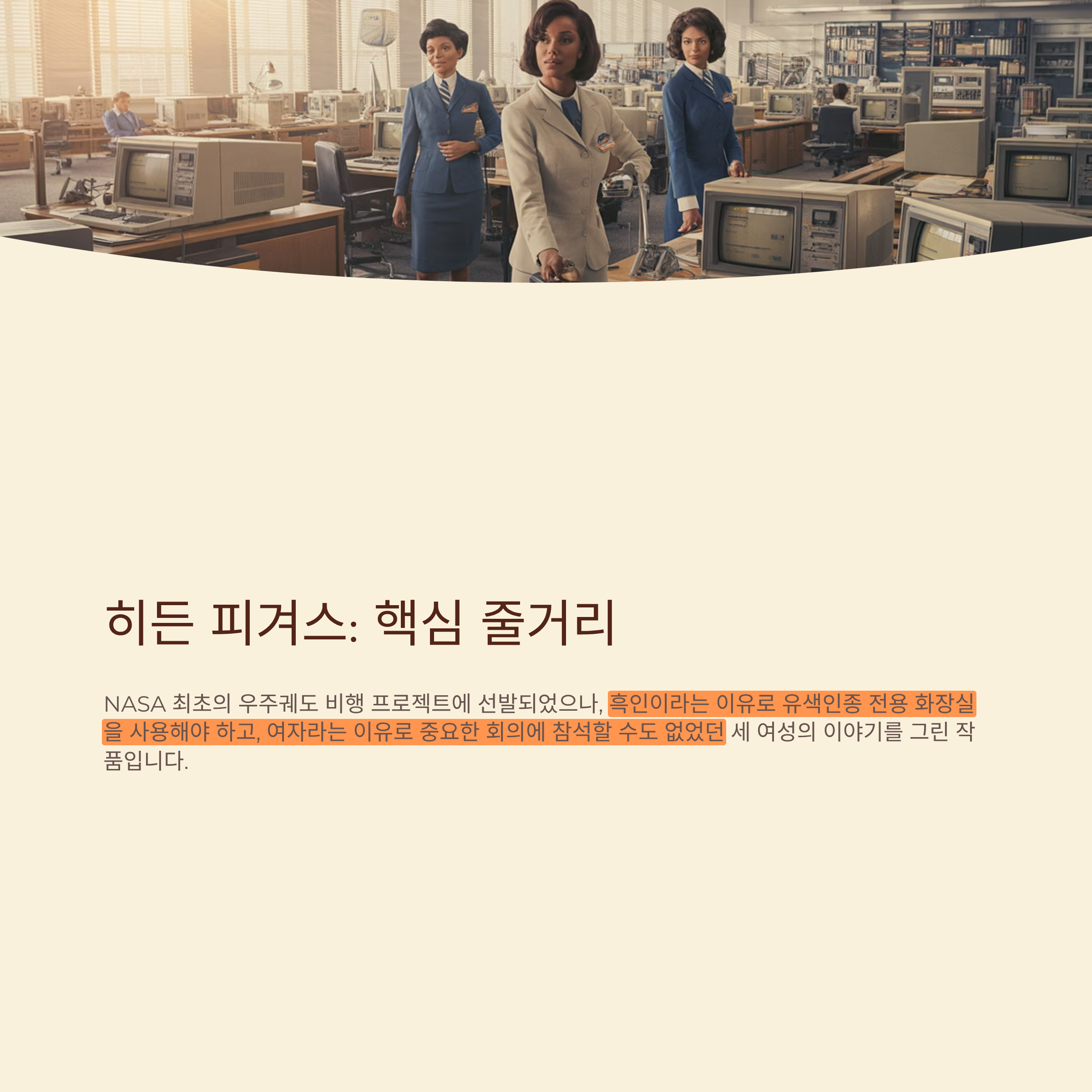 NASA 최초의 우주궤도 비행 프로젝트에 선발되었으나, 흑인이라는 이유로 유색인종 전용 화장실을 사용해야 하고, 여자라는 이유로 중요한 회의에 참석할 수도 없었던 세 여성의 이야기를 그린 작품입니다.