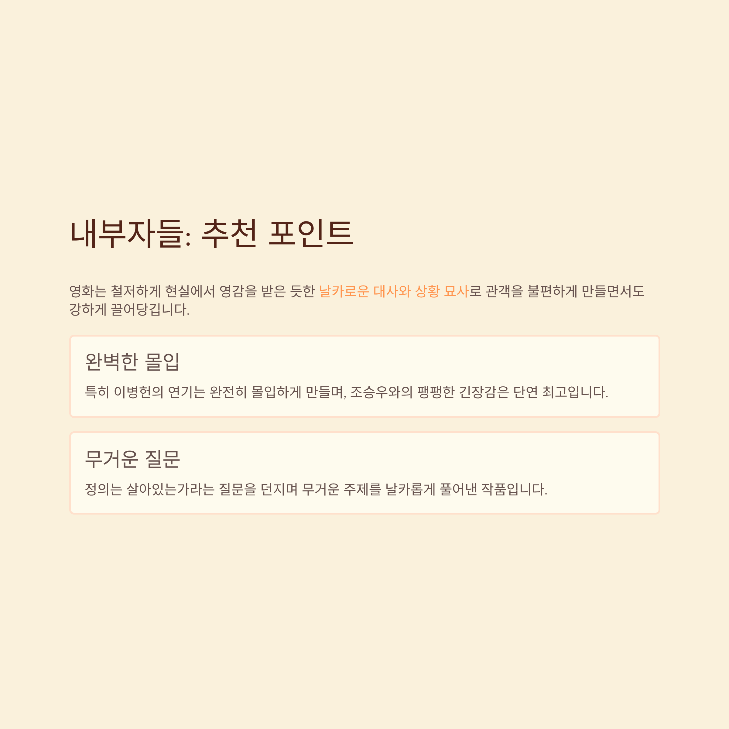 영화는 철저하게 현실에서 영감을 받은 듯한 날카로운 대사와 상황 묘사로 관객을 불편하게 만들면서도 강하게 끌어당깁니다.