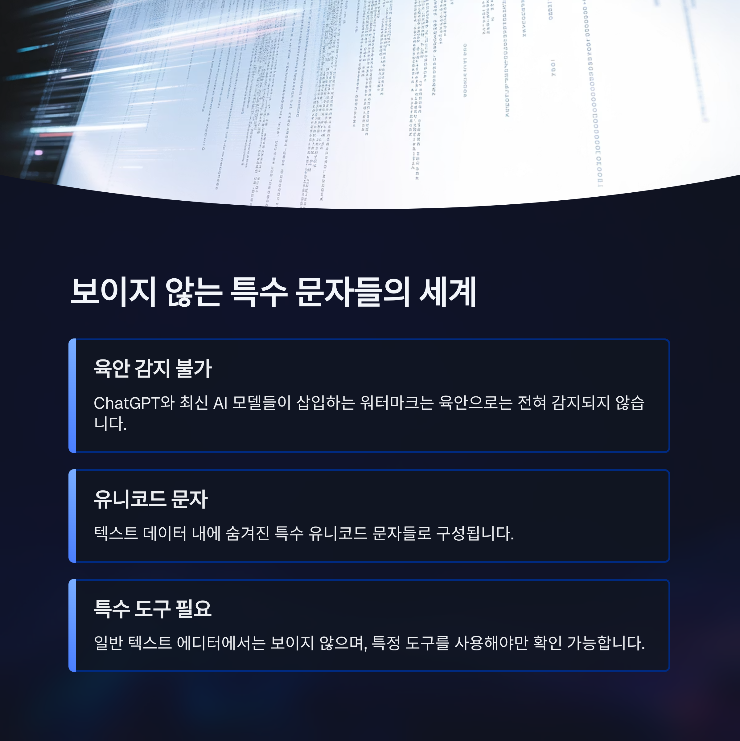 ChatGPT와 최신 AI 모델들이 삽입하는 워터마크는 육안으로는 전혀 감지되지 않지만 텍스트 데이터 내에 숨겨진 유니코드 문자들입니다.