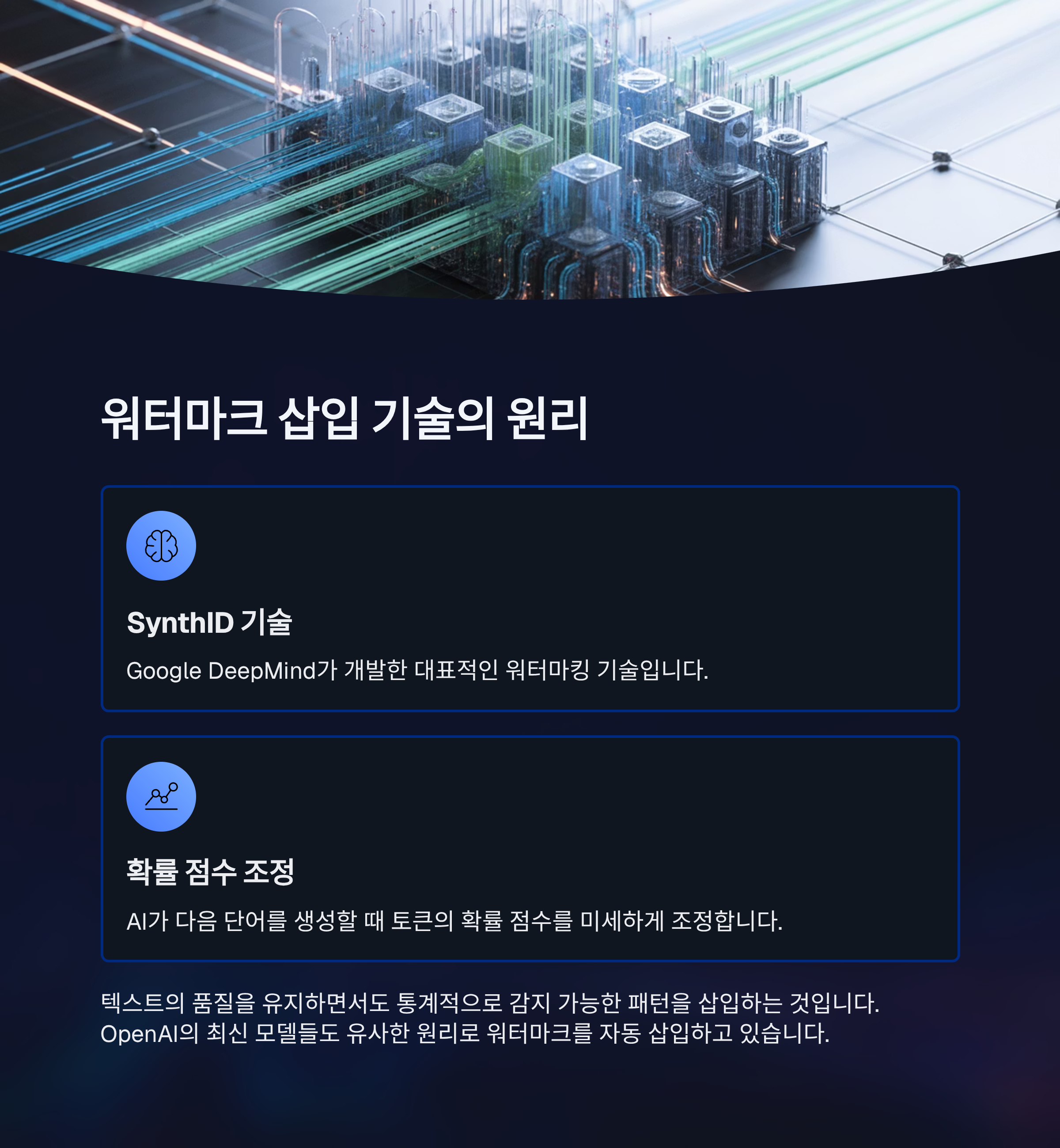 OpenAI의 최신 모델들도 유사한 원리로 워터마크를 자동 삽입하고 있으며, 이는 실시간으로 이루어집니다.