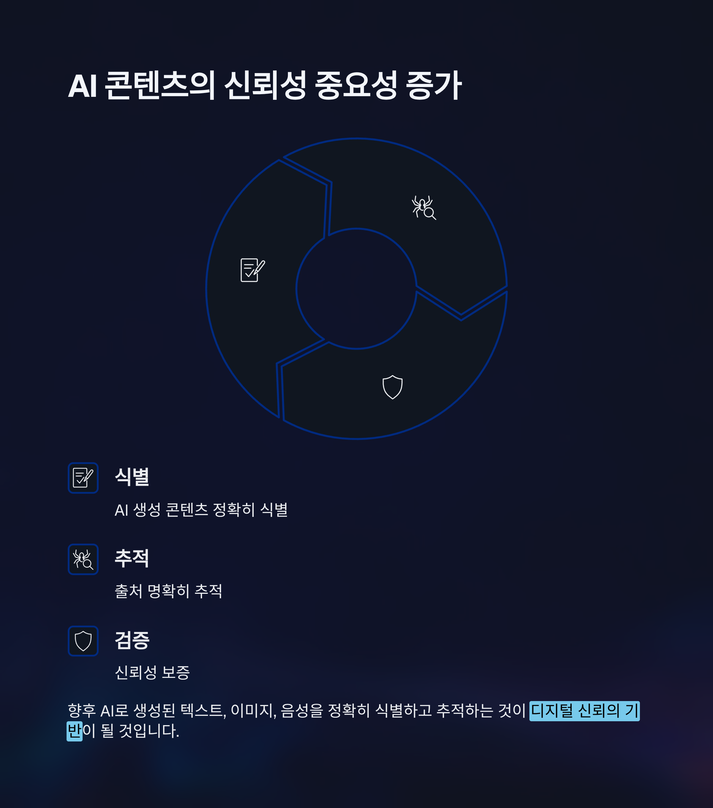 향후 AI로 생성된 텍스트, 이미지, 음성을 정확히 식별하고 추적하는 것이 디지털 신뢰의 기반이 될 것입니다.