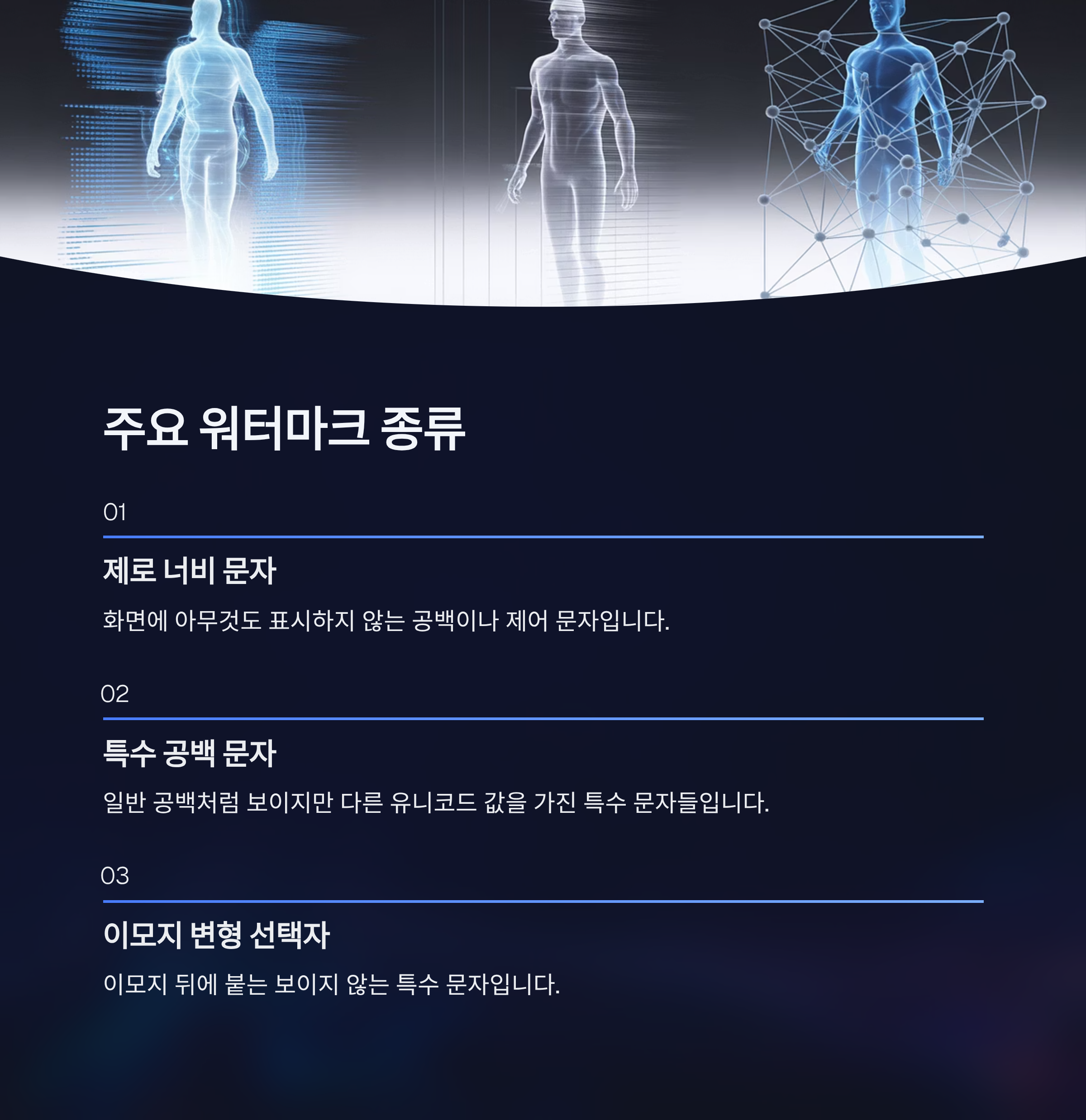 첫 번째는 제로 너비 문자(Zero-Width Characters)로, 화면에 아무것도 표시하지 않는 공백이나 제어 문자입니다.