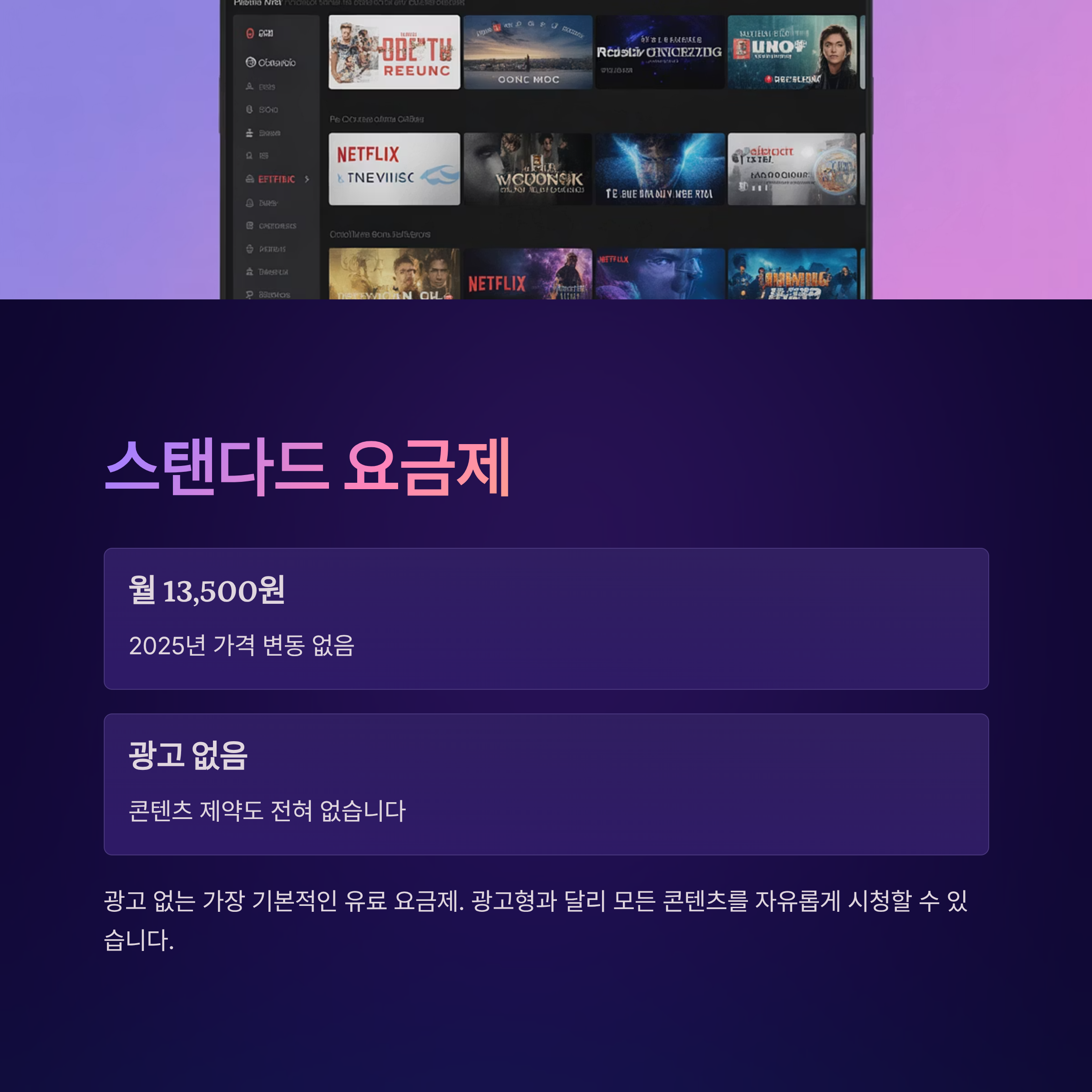 스탠다드 요금제는 광고가 없는 가장 기본적인 유료 요금제입니다. 2025년에도 월 13,500원으로 가격 변동이 없습니다. 광고형과 다르게 콘텐츠 제약이 없고, 광고도 없습니다.