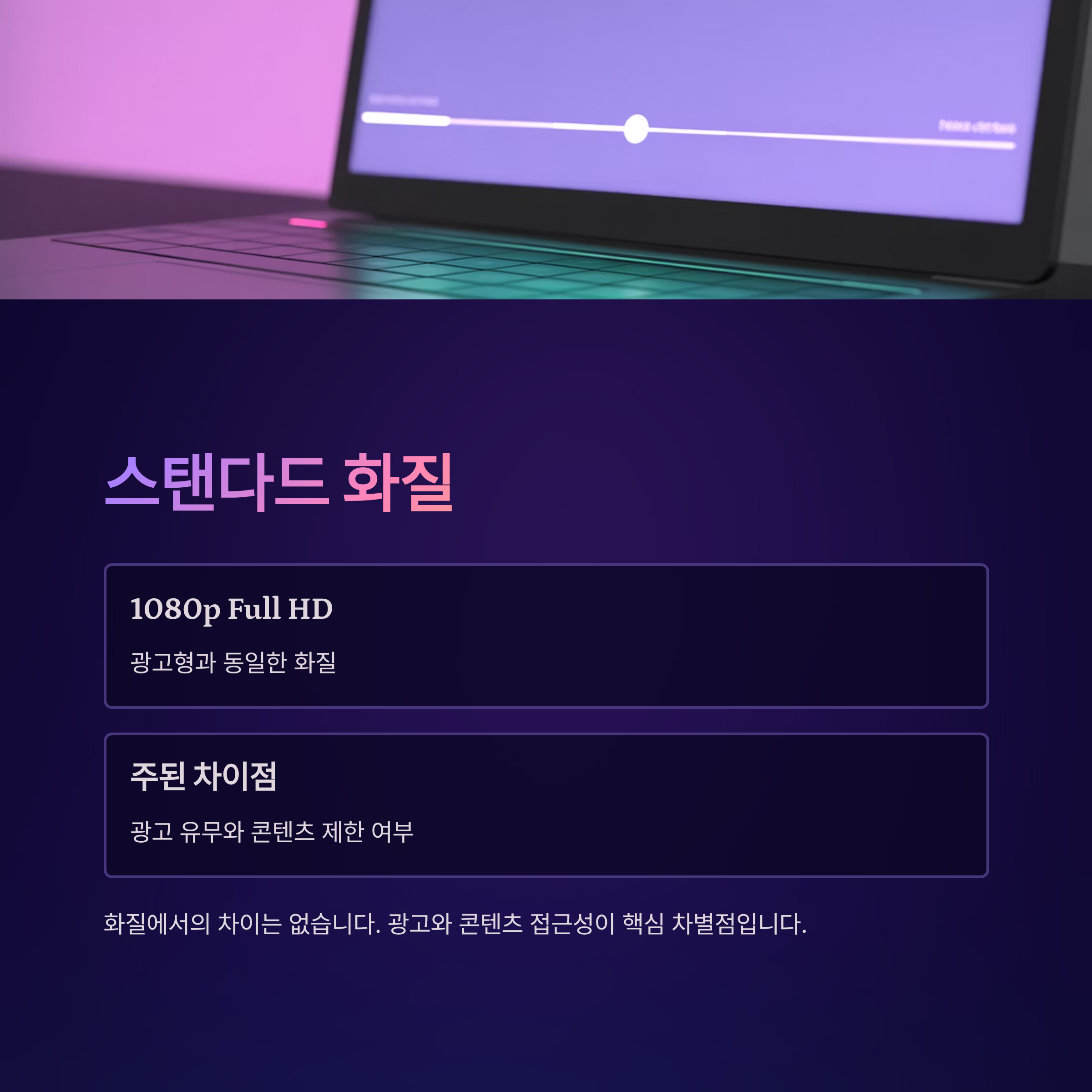 스탠다드도 광고형과 동일하게 1080p Full HD 화질을 지원합니다. 화질에서의 차이는 없으며, 주된 차이는 광고 유무와 콘텐츠 제한 여부입니다.