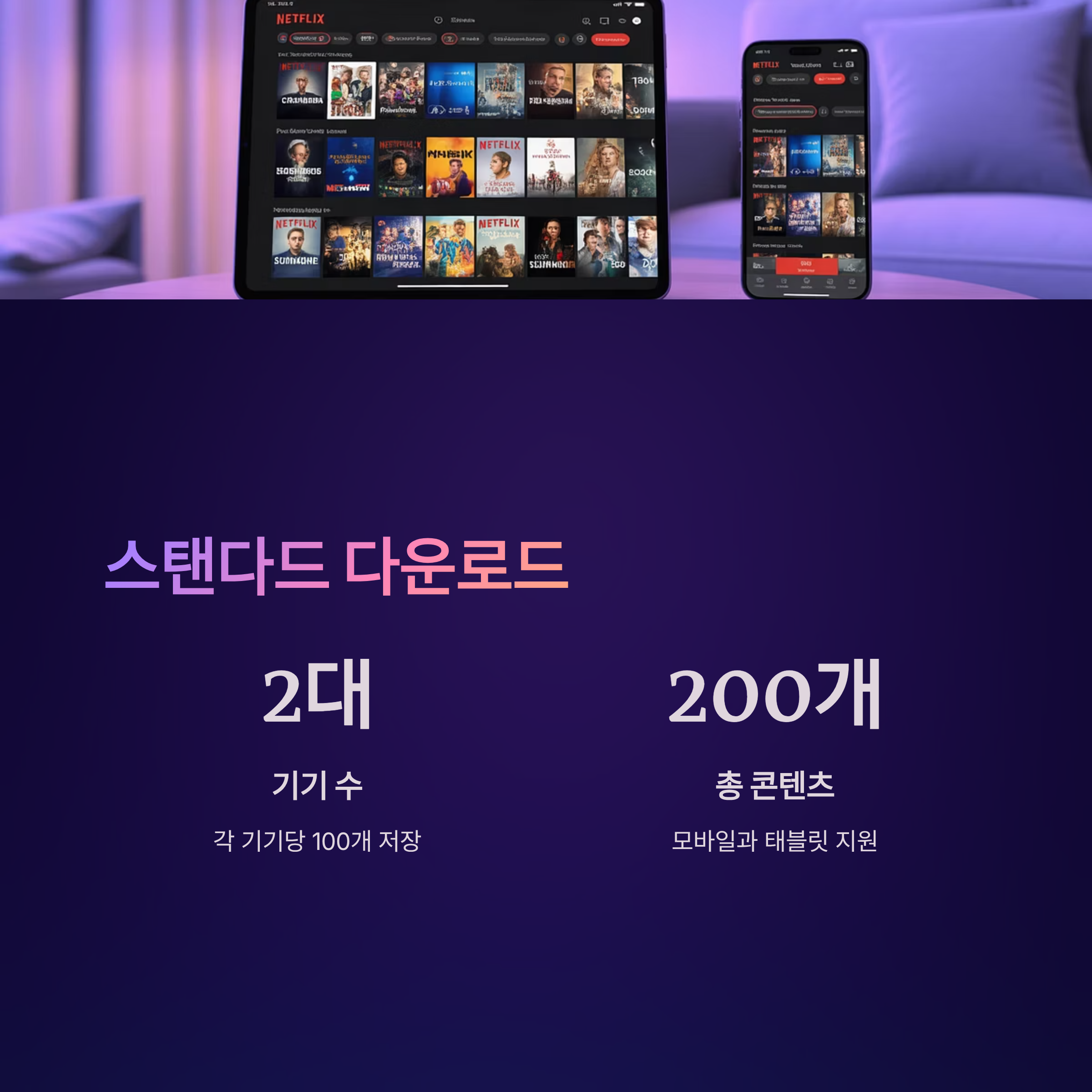 스탠다드는 최대 2대 기기에 콘텐츠를 다운로드할 수 있고, 각 기기당 100개의 콘텐츠를 저장할 수 있습니다. 총 200개의 콘텐츠를 다운로드할 수 있다는 뜻입니다. 모바일과 태블릿 둘 다 지원됩니다.