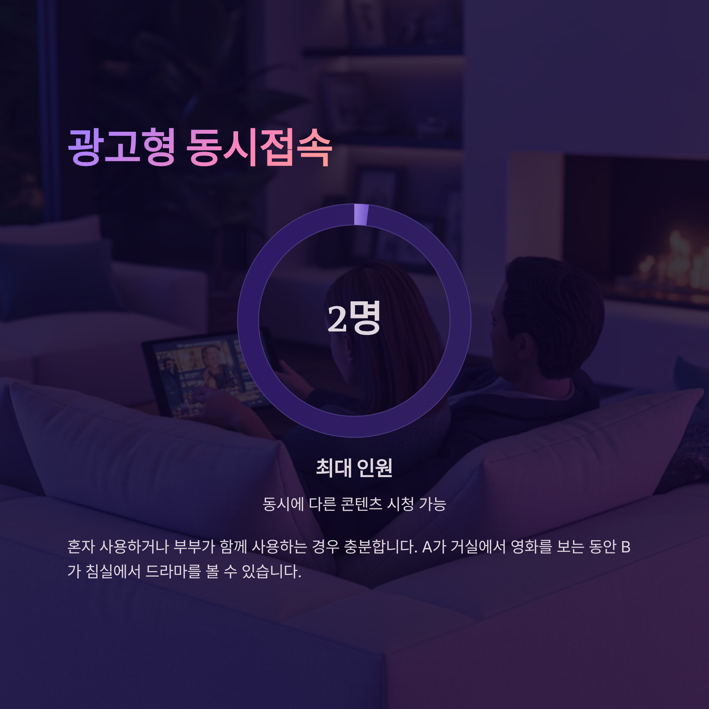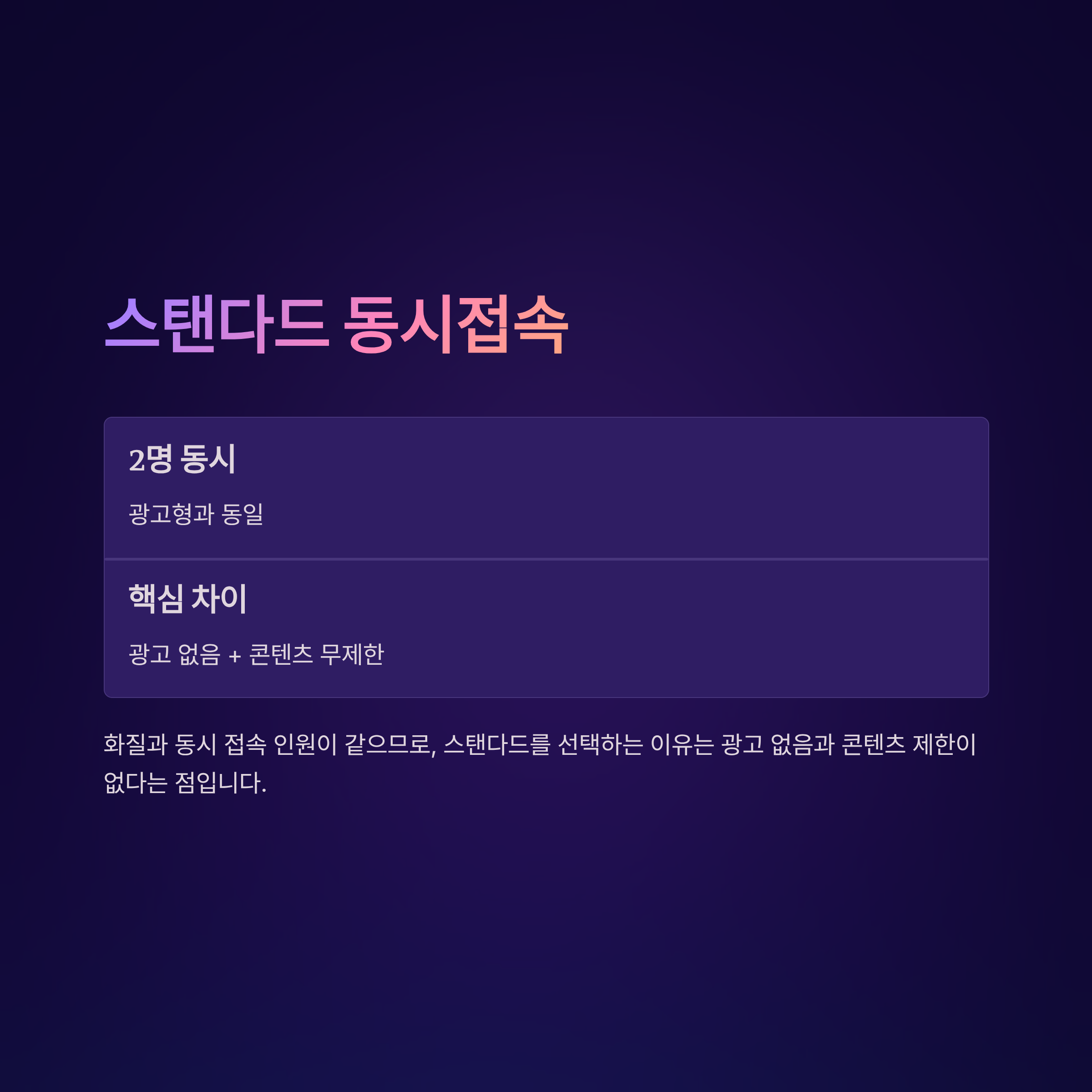 광고형 스탠다드는 최대 2명이 동시에 다른 콘텐츠를 볼 수 있습니다. 즉, A가 거실에서 영화를 보는 동안 B가 침실에서 드라마를 볼 수 있다는 뜻입니다. 혼자 사용하는 경우나 부부가 함께 사용하는 경우에는 충분합니다.