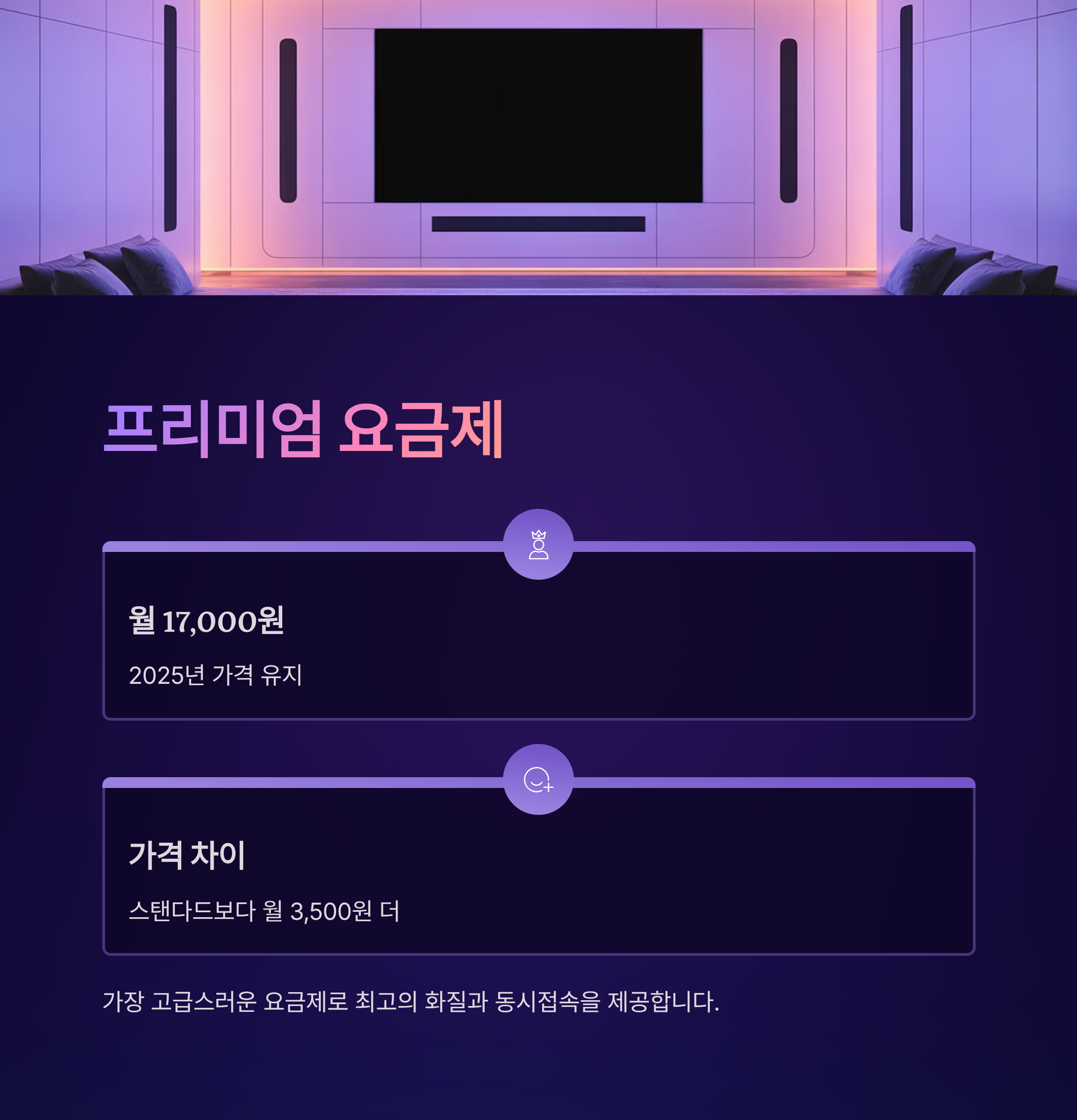 프리미엄 요금제는 가장 고급스러운 요금제입니다. 월 17,000원으로 2025년에도 가격이 그대로 유지되고 있습니다. 스탠다드와의 가격 차이는 월 3,500원입니다.