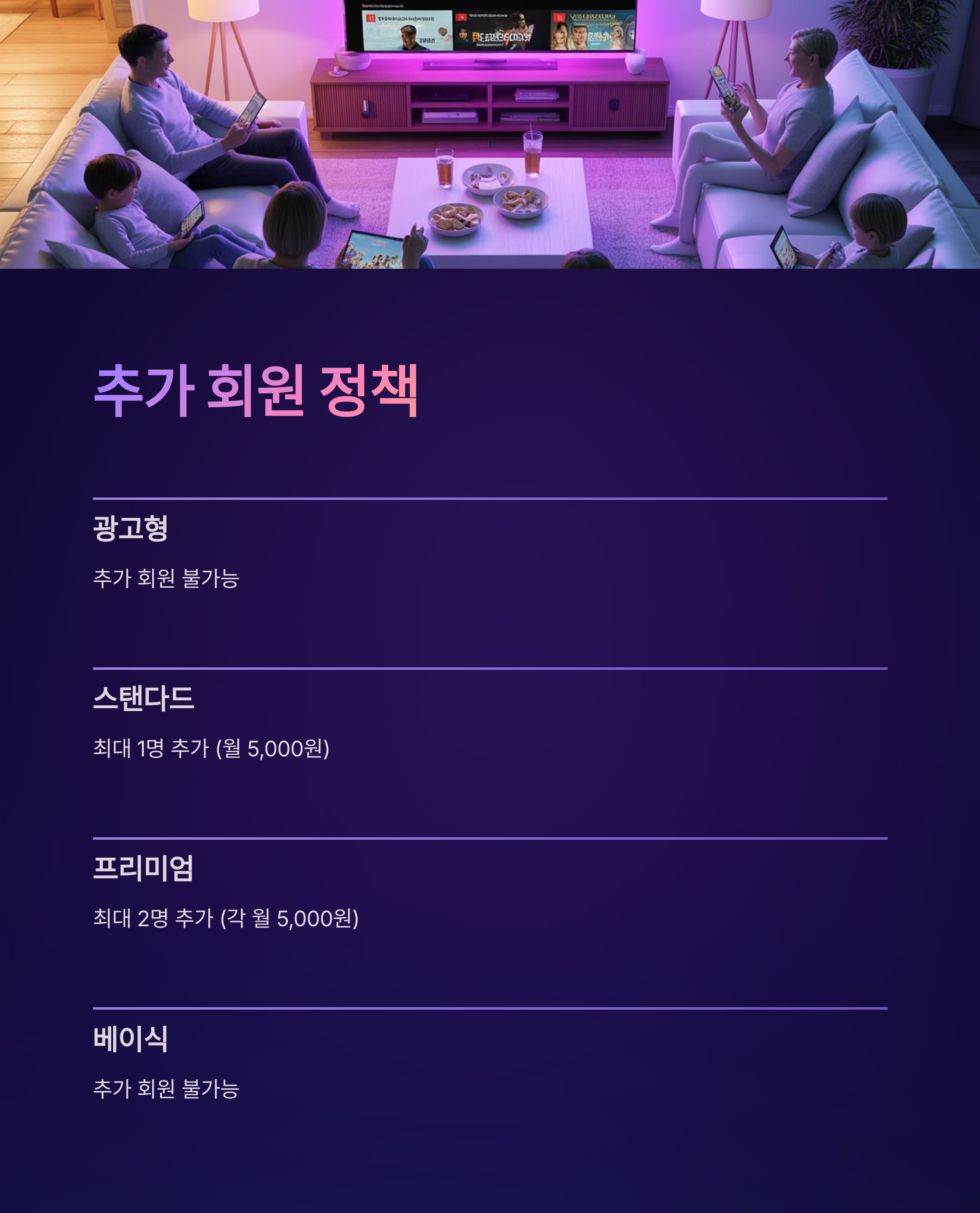 - 광고형 스탠다드: 월 7,000원 (1인: 3,500원) - 추가 회원 불가능하므로 계정 공유만 가능