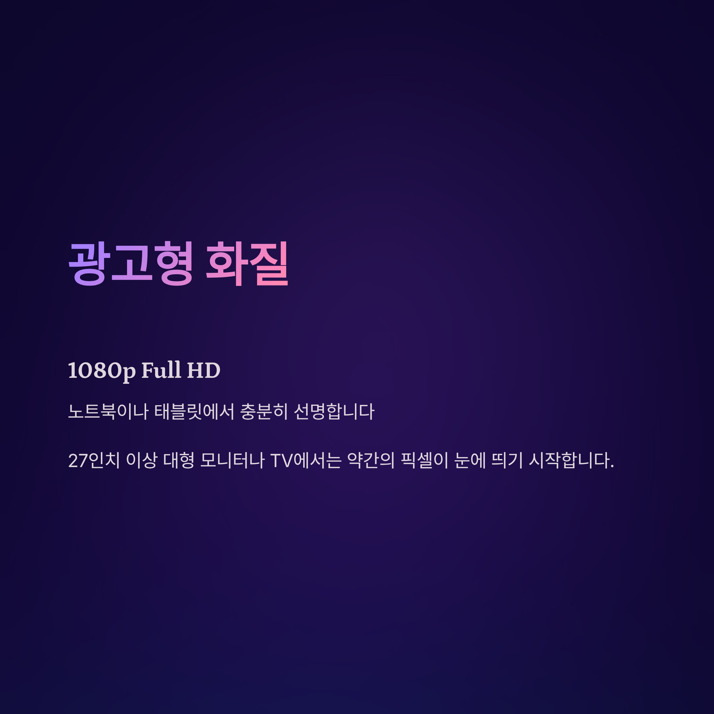 광고형 스탠다드는 1080p 해상도, 즉 Full HD 화질을 지원합니다. 이는 일반적인 노트북이나 태블릿에서는 충분히 선명하게 보이는 수준입니다. 하지만 27인치 이상의 대형 모니터나 TV에서는 약간의 픽셀이 눈에 띄기 시작합니다.