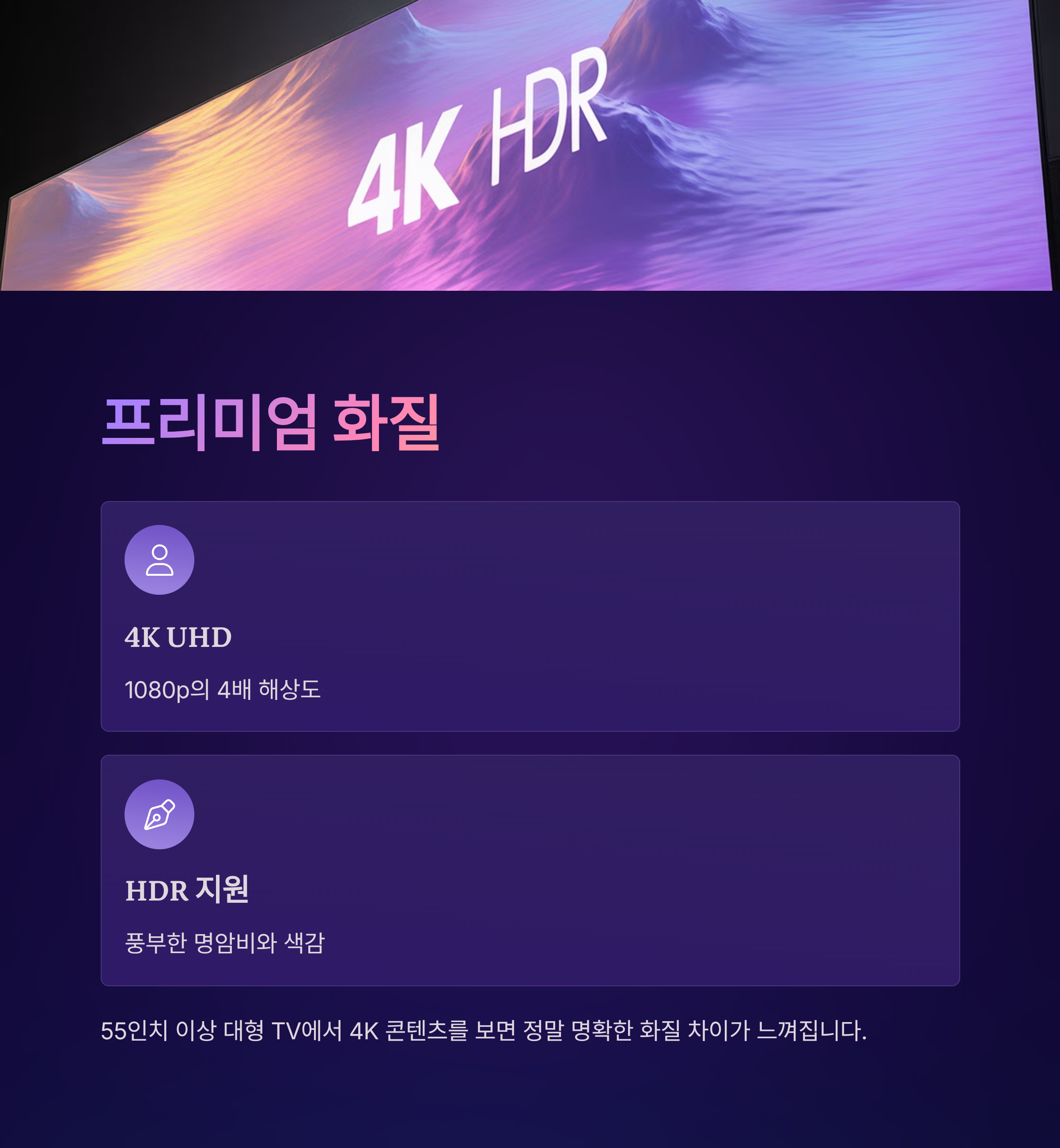 - 4K + HDR 화질로 큰 TV에서도 선명