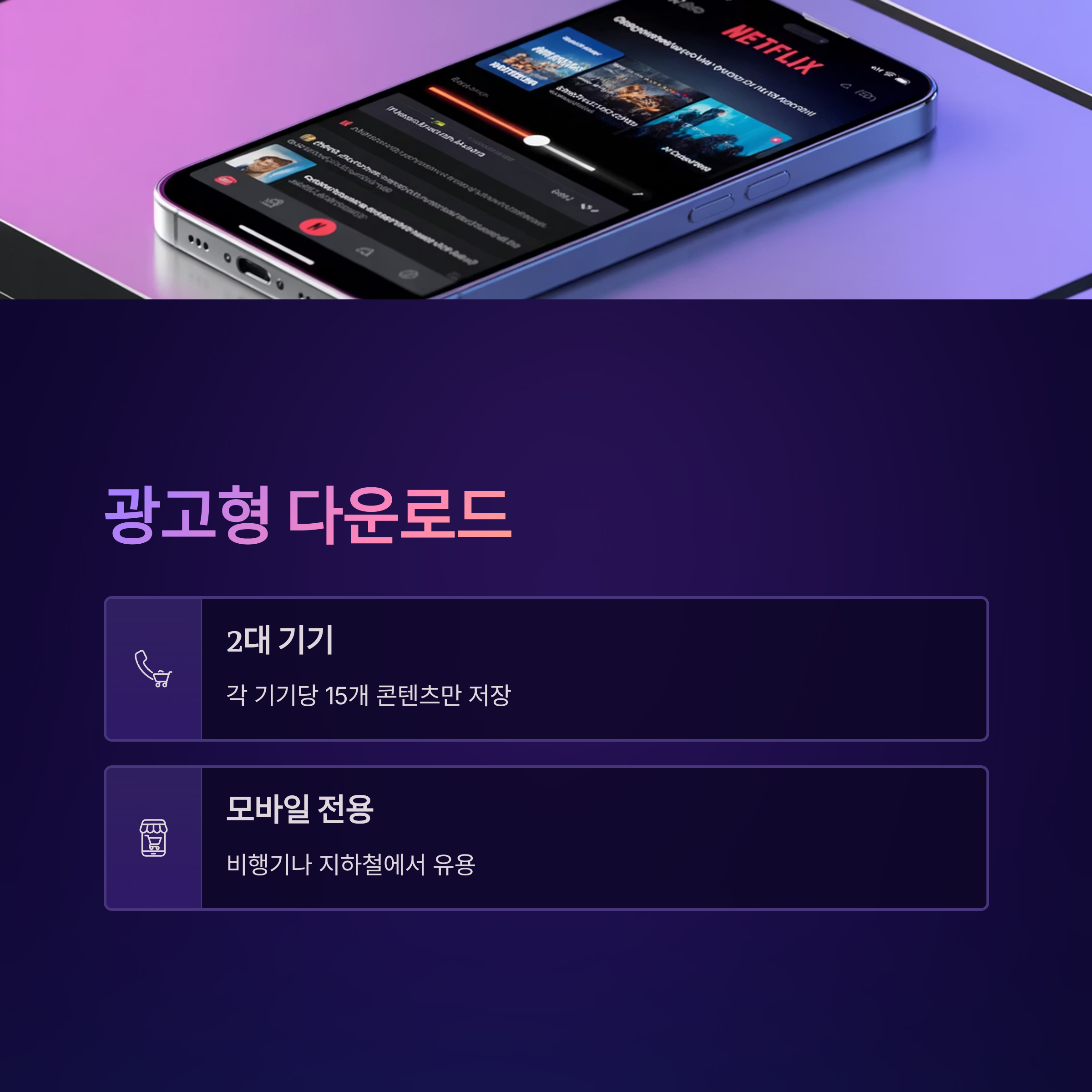 광고형 스탠다드는 최대 2대 기기에 콘텐츠를 다운로드할 수 있습니다. 각 기기당 15개의 콘텐츠만 저장 가능합니다. 모바일 전용입니다. 비행기를 탈 때나 지하철에서 볼 몇 개 에피소드를 다운로드할 때 유용하지만, 많은 콘텐츠를 저장할 수 없습니다.