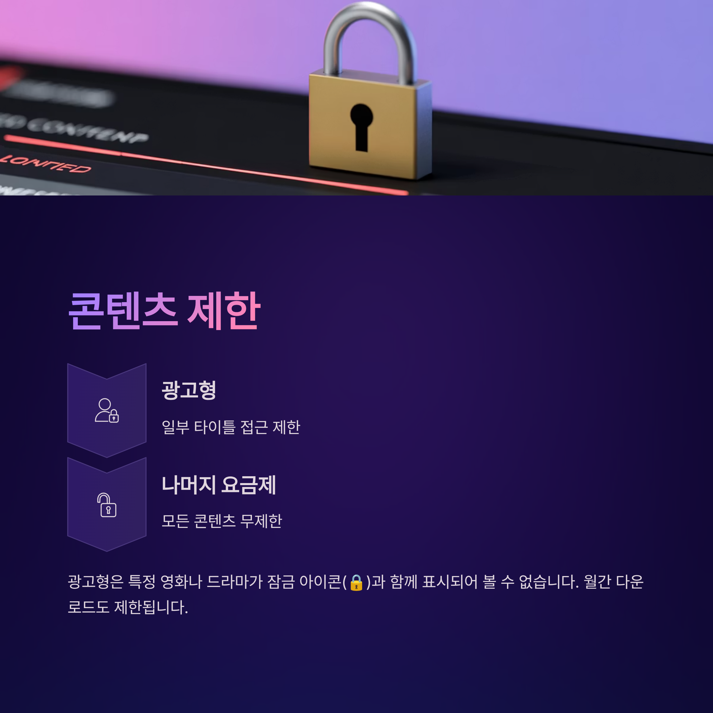 광고형 스탠다드는 일부 타이틀에서 콘텐츠 접근이 제한됩니다. 특정 영화나 드라마는 잠금 아이콘(🔒)과 함께 표시되어 광고형에서는 볼 수 없습니다. 정확히 어떤 콘텐츠가 제한되는지는 공개하지 않습니다. 또한 월간 다운로드 제한도 있습니다(기기당 15개).