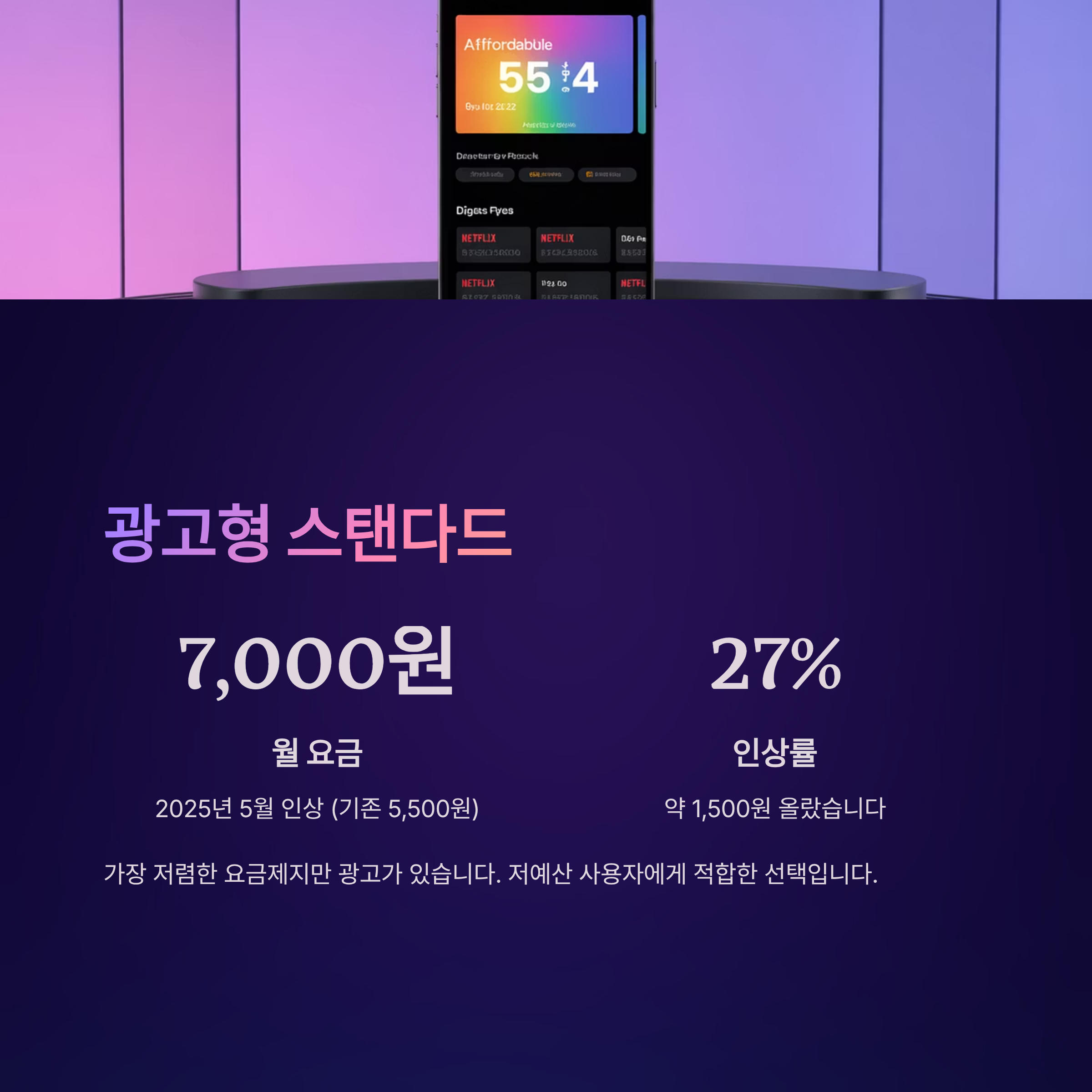 광고형 스탠다드는 가장 저렴한 요금제입니다. 2025년 5월 9일 가격 인상으로 기존의 5,500원에서 7,000원으로 올랐습니다. 이는 약 27% 인상된 것입니다. 광고형 스탠다드의 가장 큰 특징은 월 7,000원이라는 저렴한 가격입니다. 하지만 이 저렴함에는 대가가 있습니다.