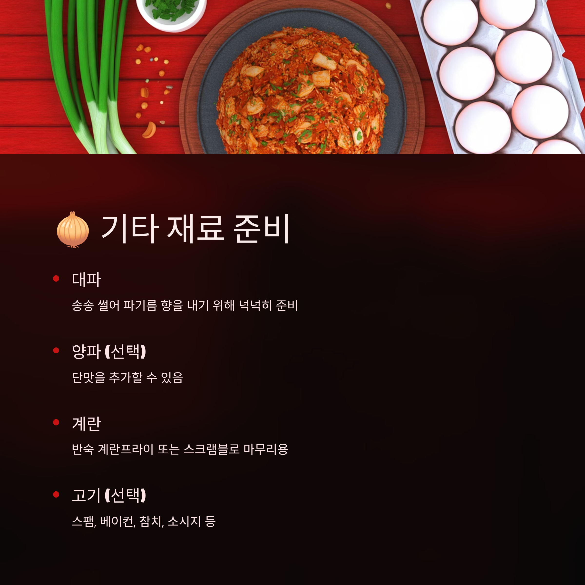 준비 단계에서는 찬밥을 준비하고, 김치를 잘게 썬 후, 대파와 마늘을 송송 썰어 놓습니다.