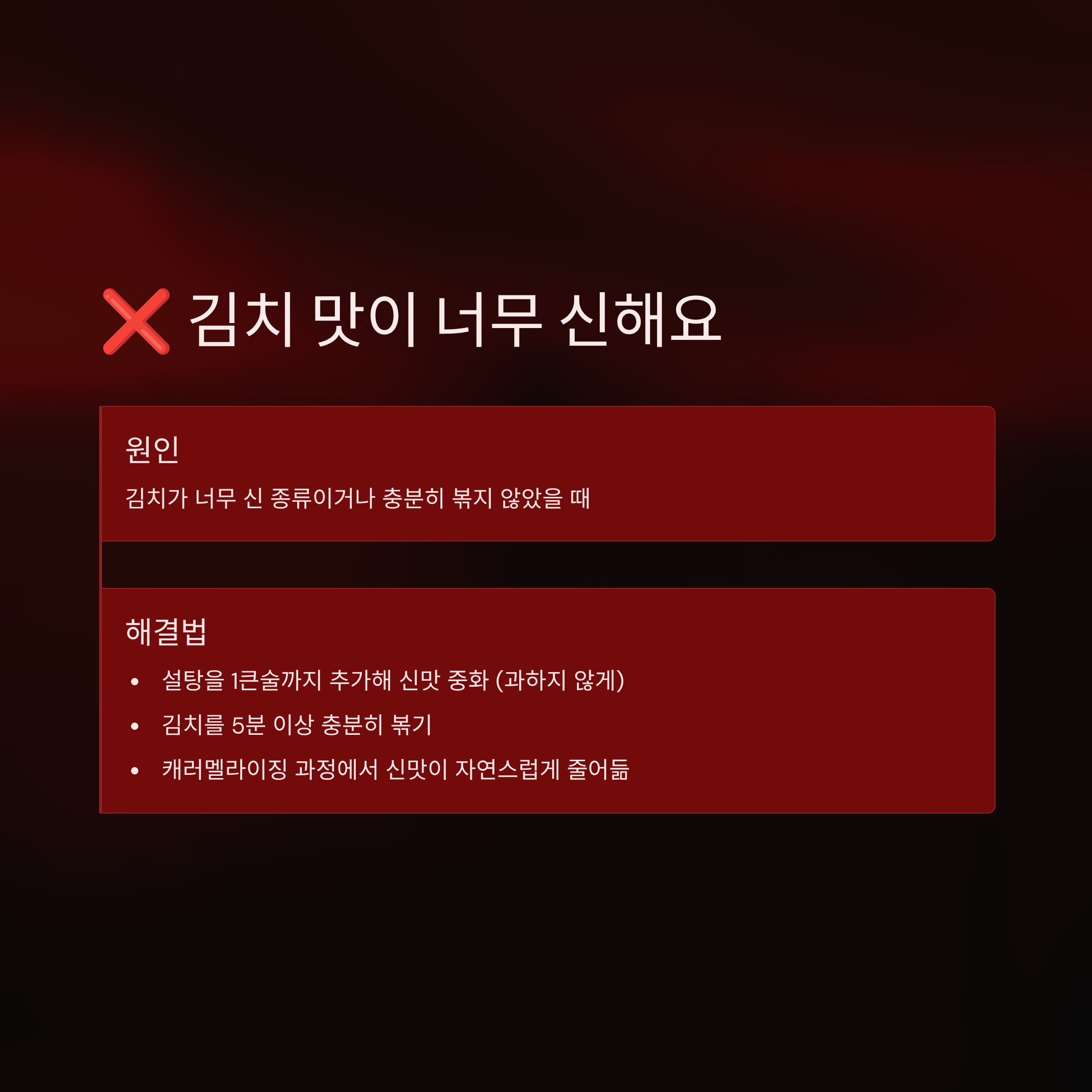 원인은 김치가 너무 신 종류이거나 충분히 볶지 않았을 때입니다.