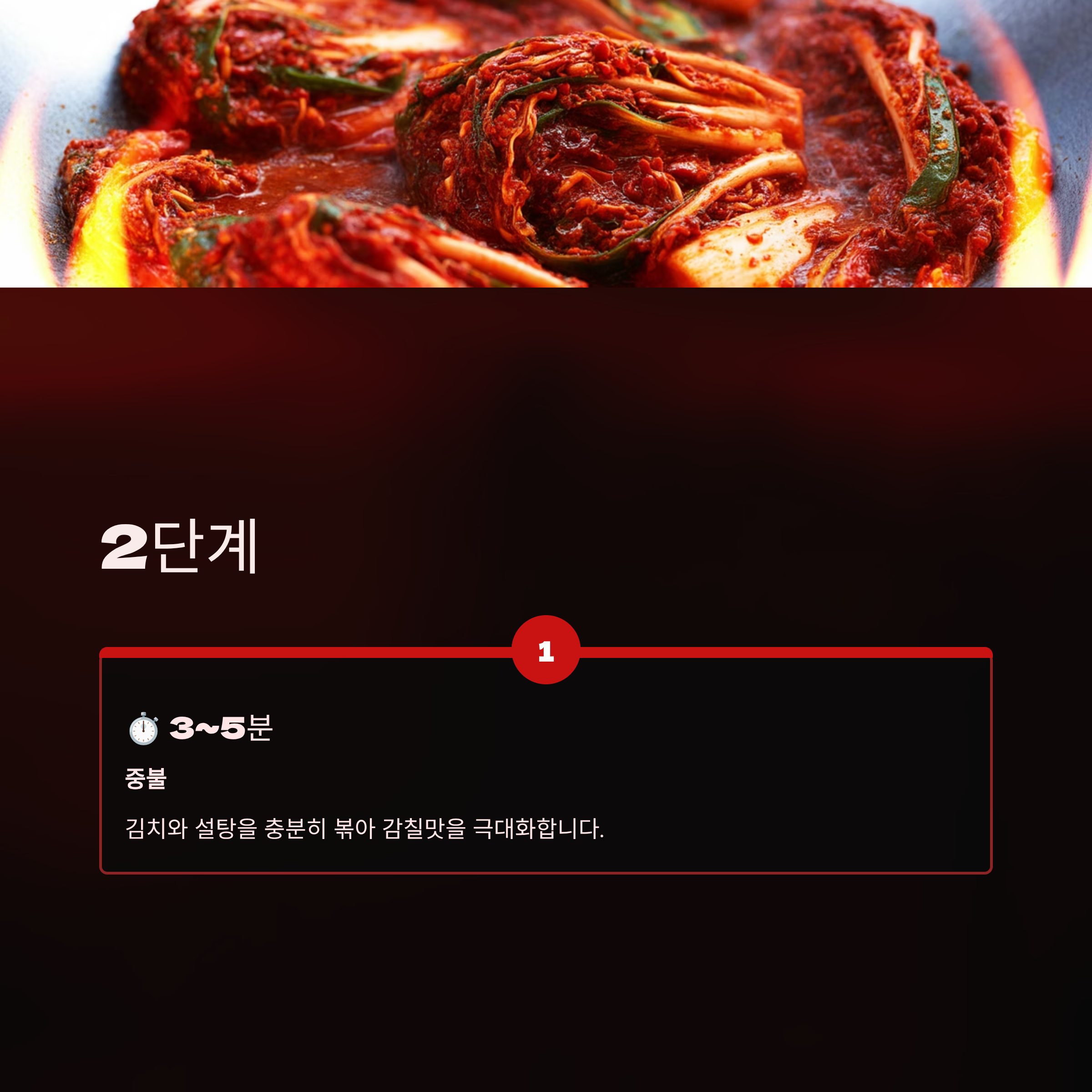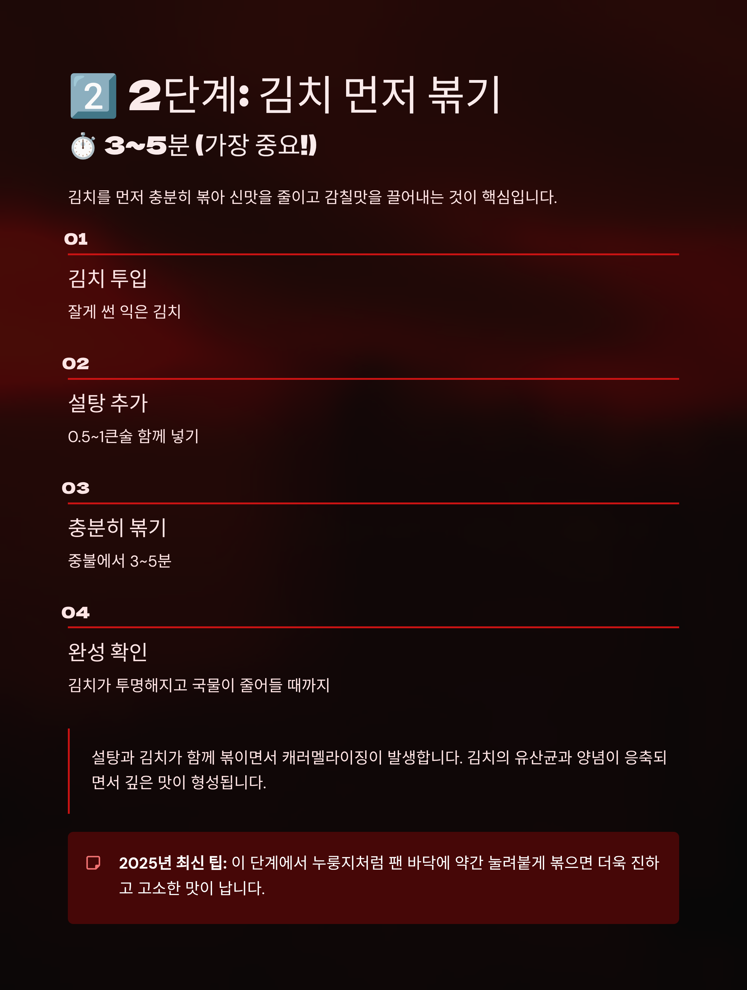 2단계에서는 3~5분의 시간을 들여 중불에서 김치와 설탕을 충분히 볶아 감칠맛을 극대화합니다.
