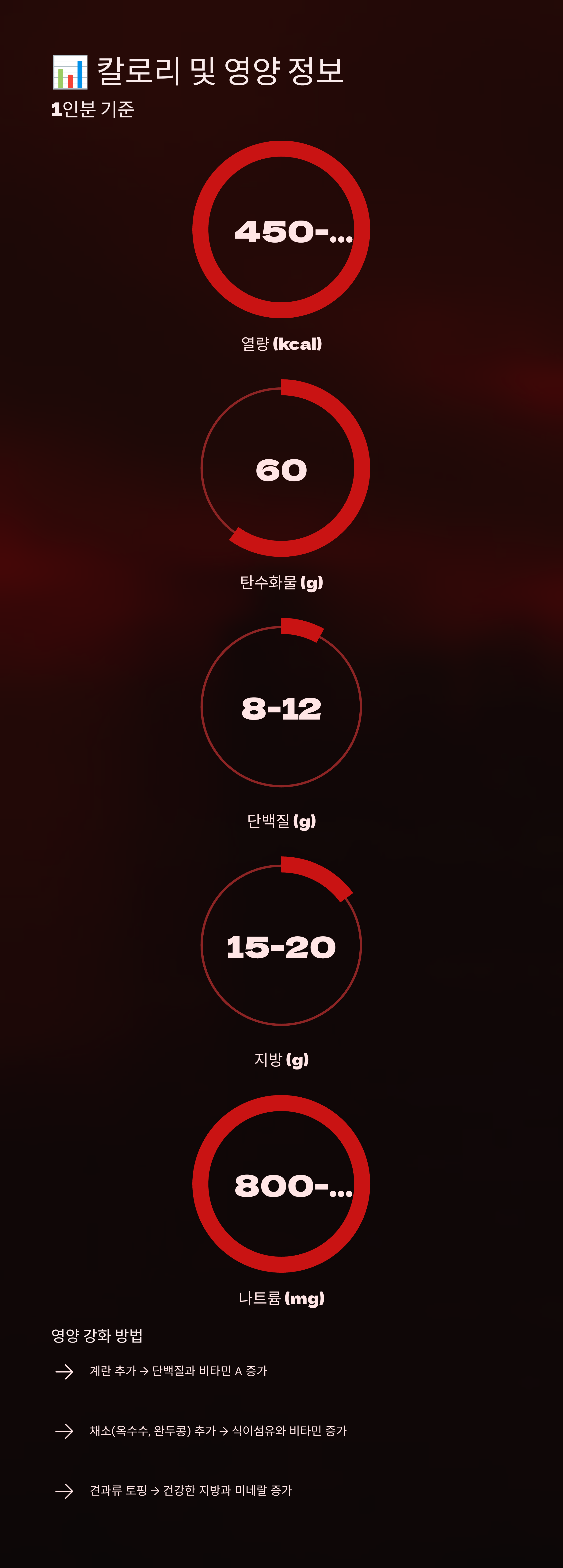 영양을 강화하려면 계란을 추가해서 단백질과 비타민 A를 증가시킬 수 있습니다. 채소(옥수수, 완두콩 등)를 추가하면 식이섬유와 비타민이 증가합니다. 견과류를 토핑으로 올리면 건강한 지방과 미네랄이 증가합니다.