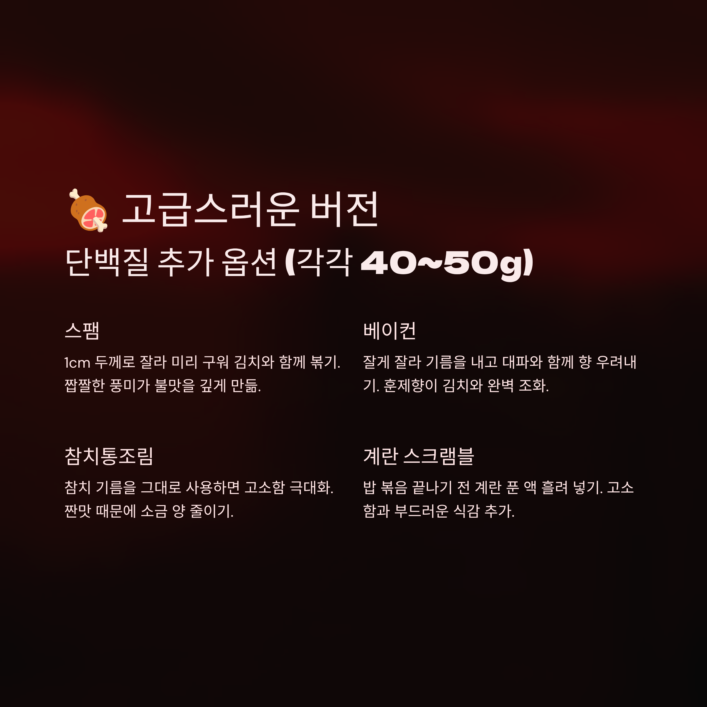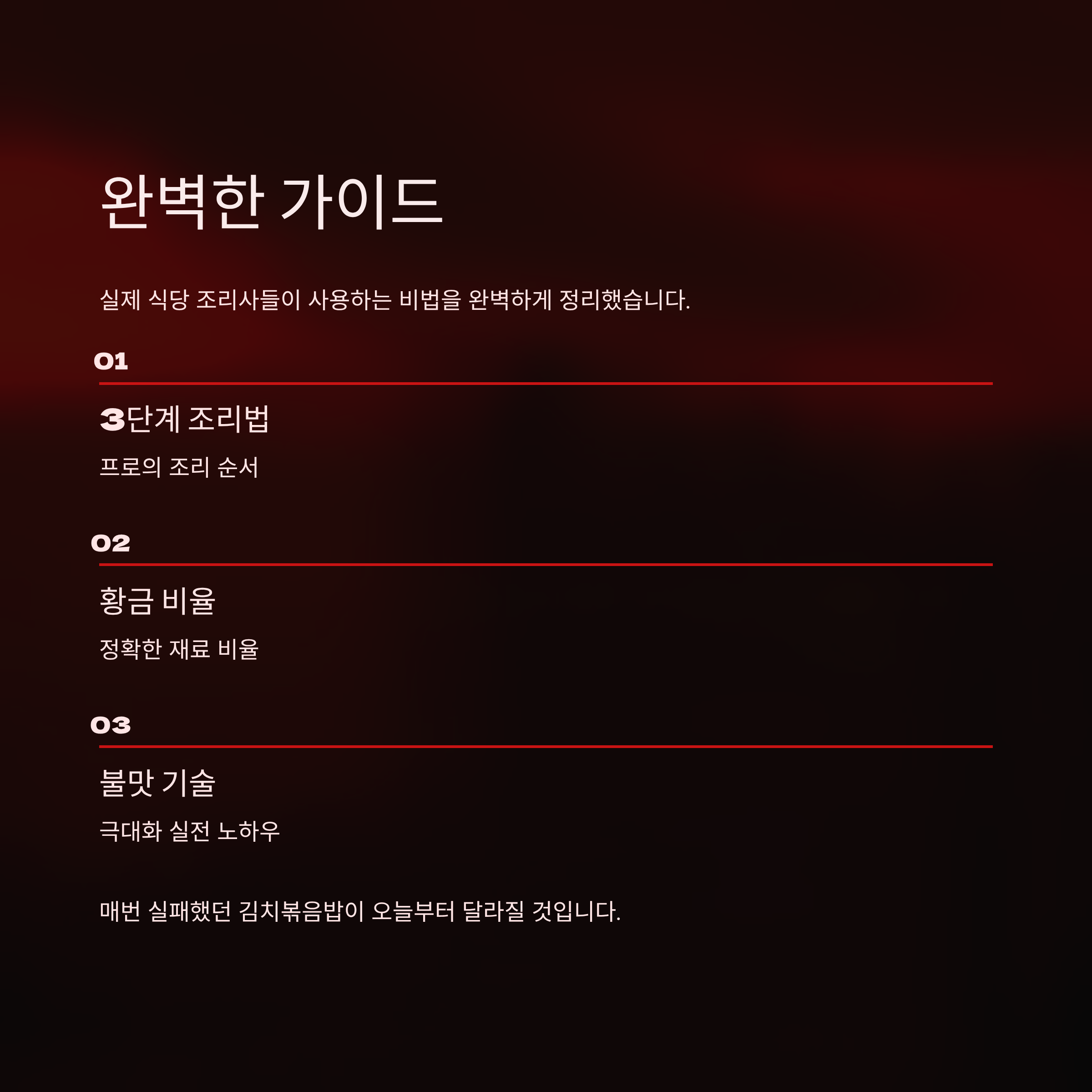 이 네 가지만 지키면 누구나 집에서도 식당의 깊은 불맛이 있는 김치볶음밥을 만들 수 있습니다. 오늘 소개한 3단계 조리법과 황금 비율을 기억하고, 몇 번만 반복하면 당신도 김치볶음밥의 마스터가 될 것입니다.