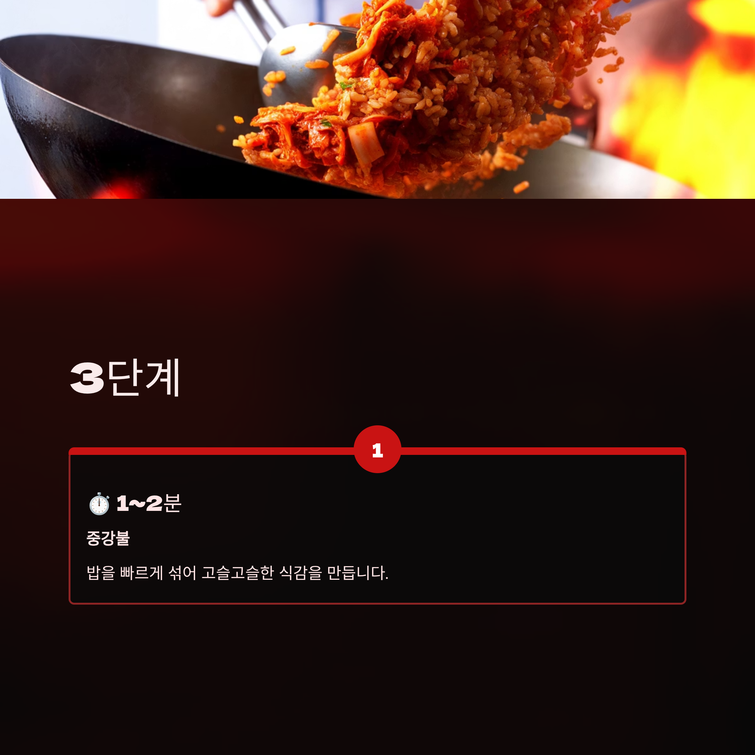 그 후 빠르게 밥과 섞습니다. 연기와 함께 깊은 불맛과 감칠맛이 폭발합니다.