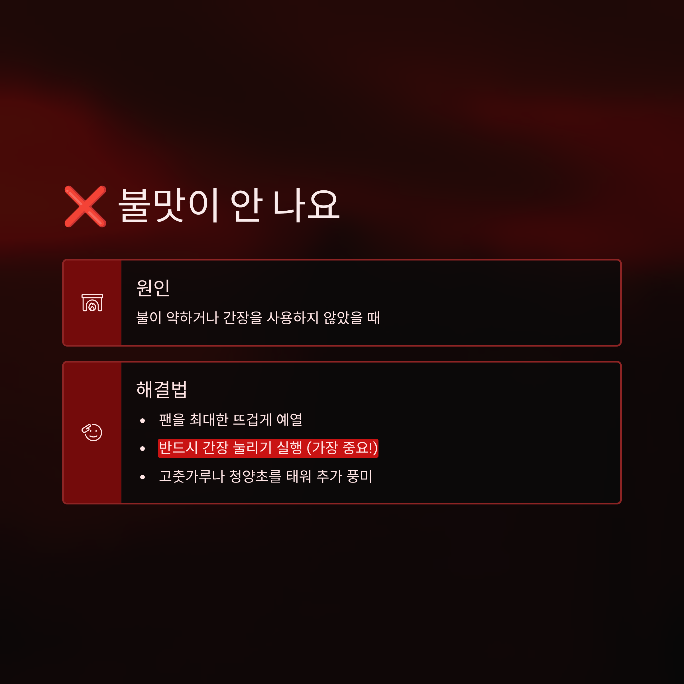 불의 강도, 재료의 순서, 그리고 황금 비율 세 가지만 제대로 알면 누구나 집에서도 식당의 깊은 불맛을 재현할 수 있습니다.
