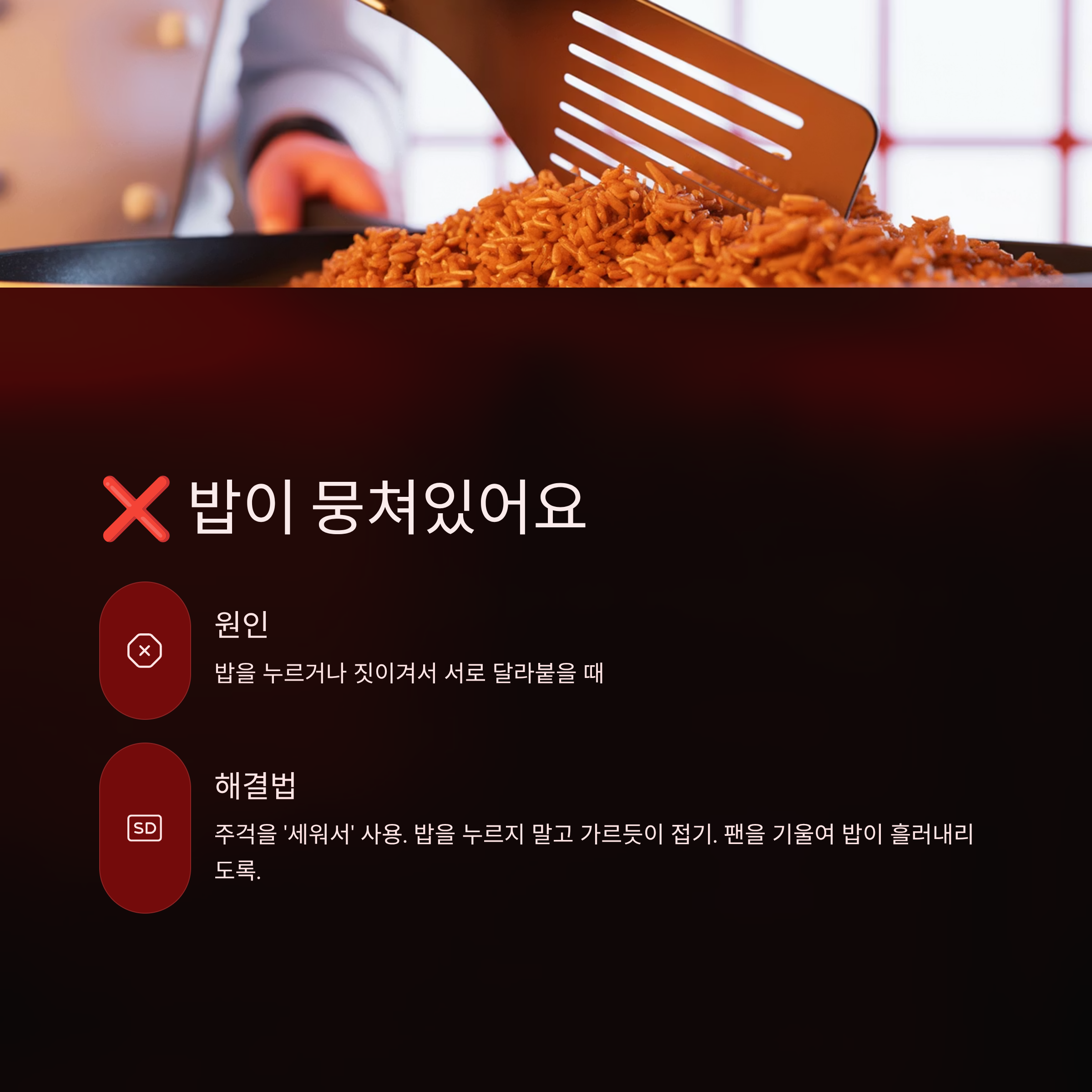 해결법으로는 주걱을 '세워서' 사용해야 합니다. 밥을 누르지 말고 가르듯이 접어야 합니다.