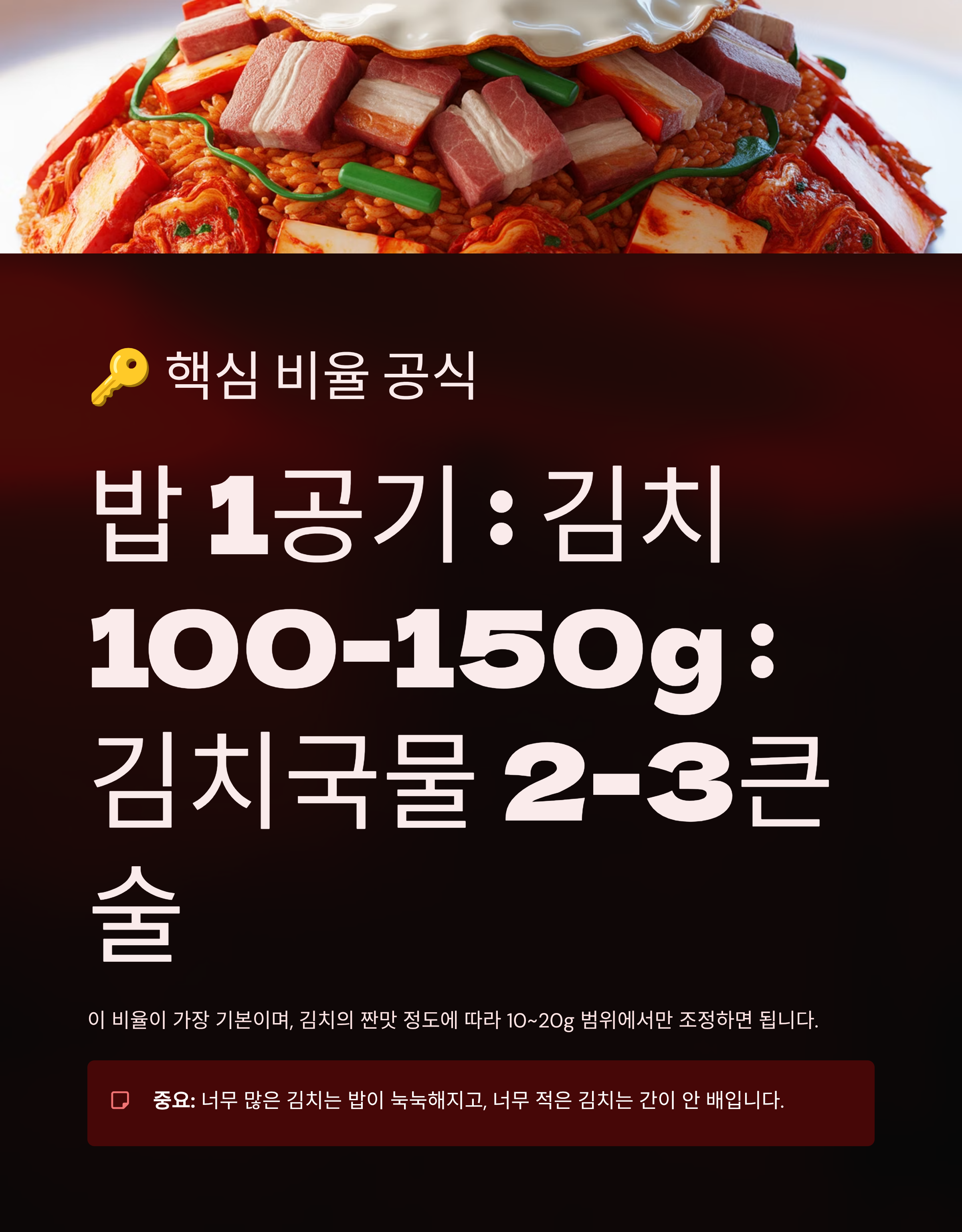 기본적인 황금 비율은 "밥 1공기 : 김치 100~150g : 김치국물 2~3큰술"입니다.