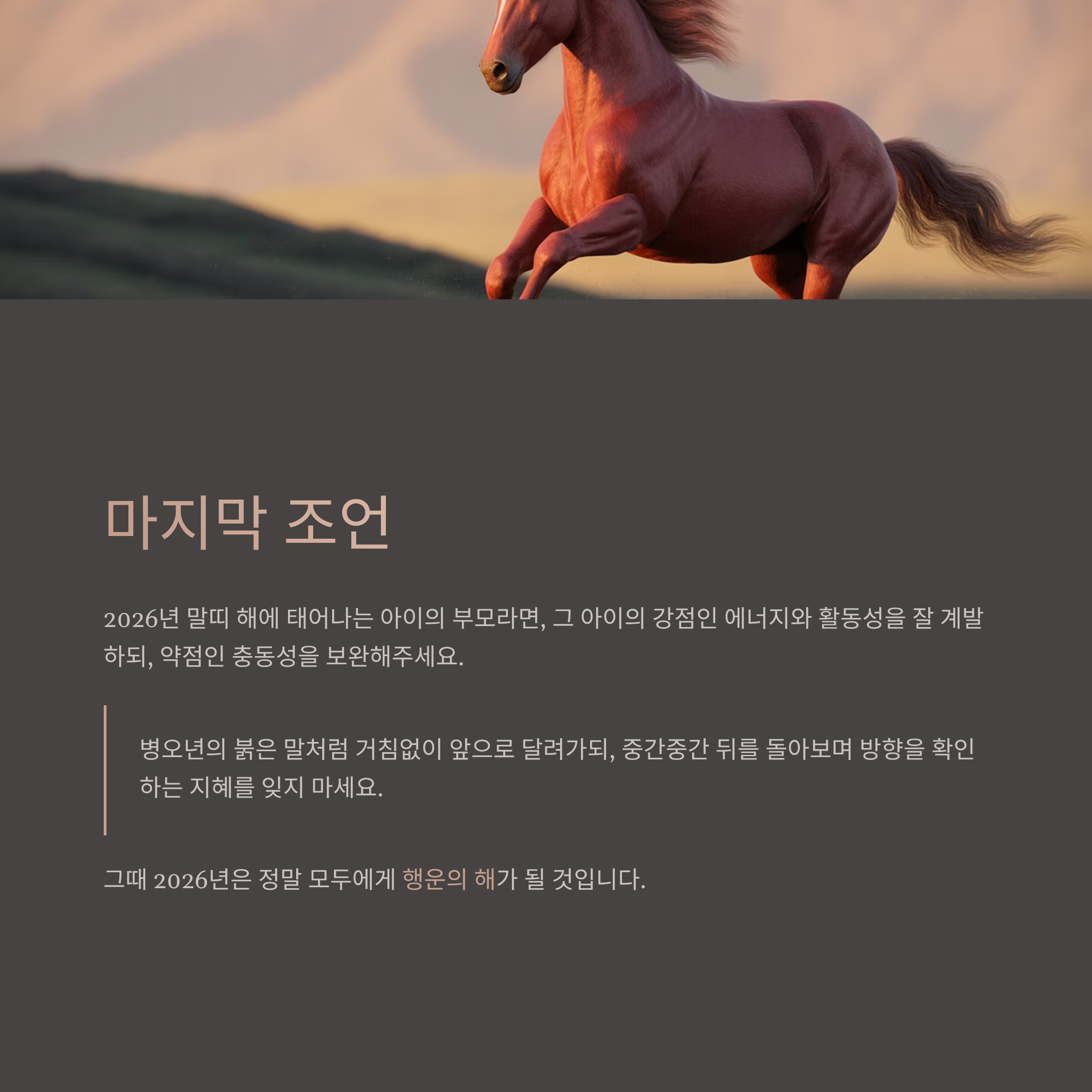 마지막으로, 병오년의 붉은 말처럼 거침없이 앞으로 달려가되, 중간중간 뒤를 돌아보며 방향을 확인하는 지혜를 잊지 마세요. 그때 2026년은 정말 모두에게 행운의 해가 될 것입니다.