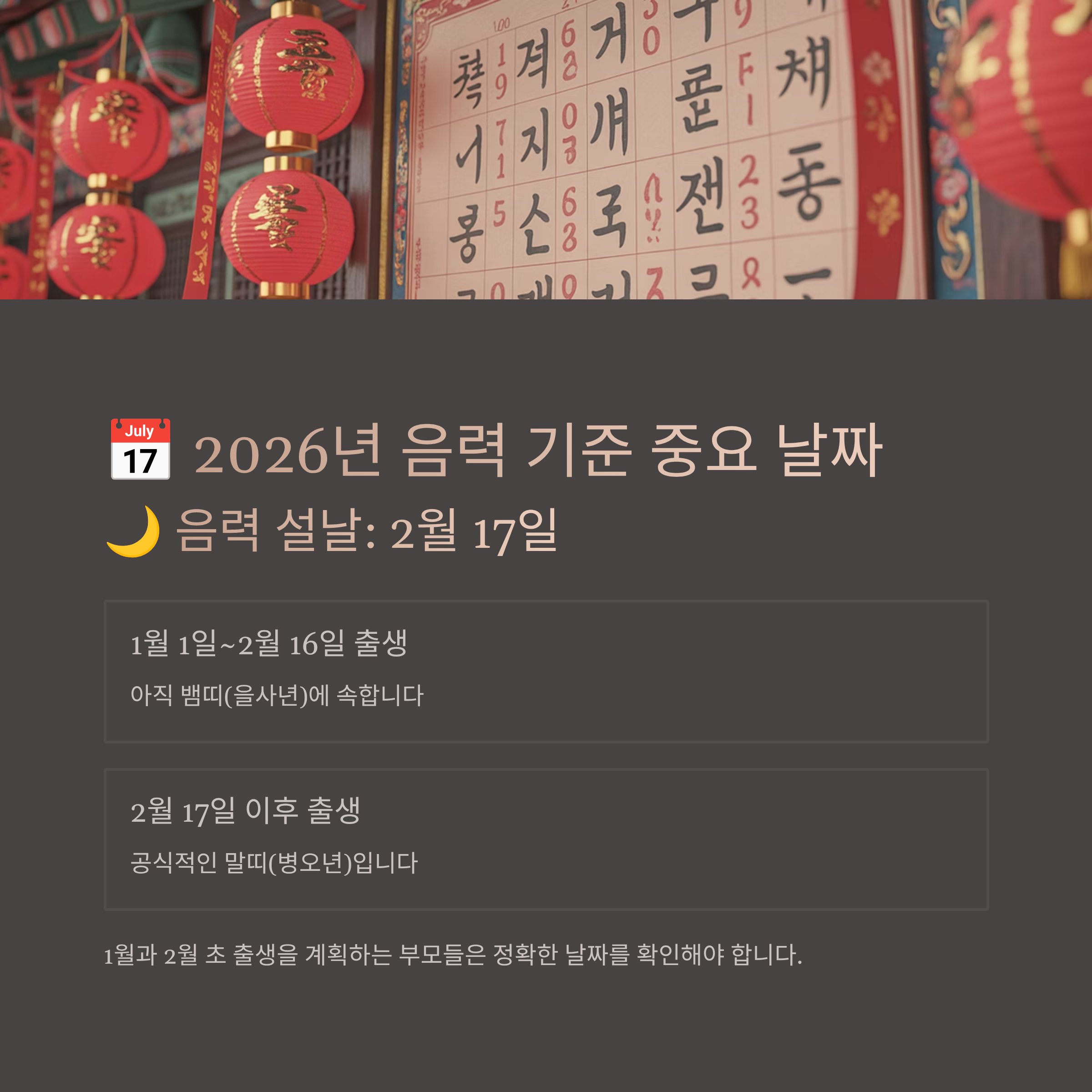 2026년 1월 1일~2월 16일 출생: 아직 뱀띠(을사년)에 속합니다.
