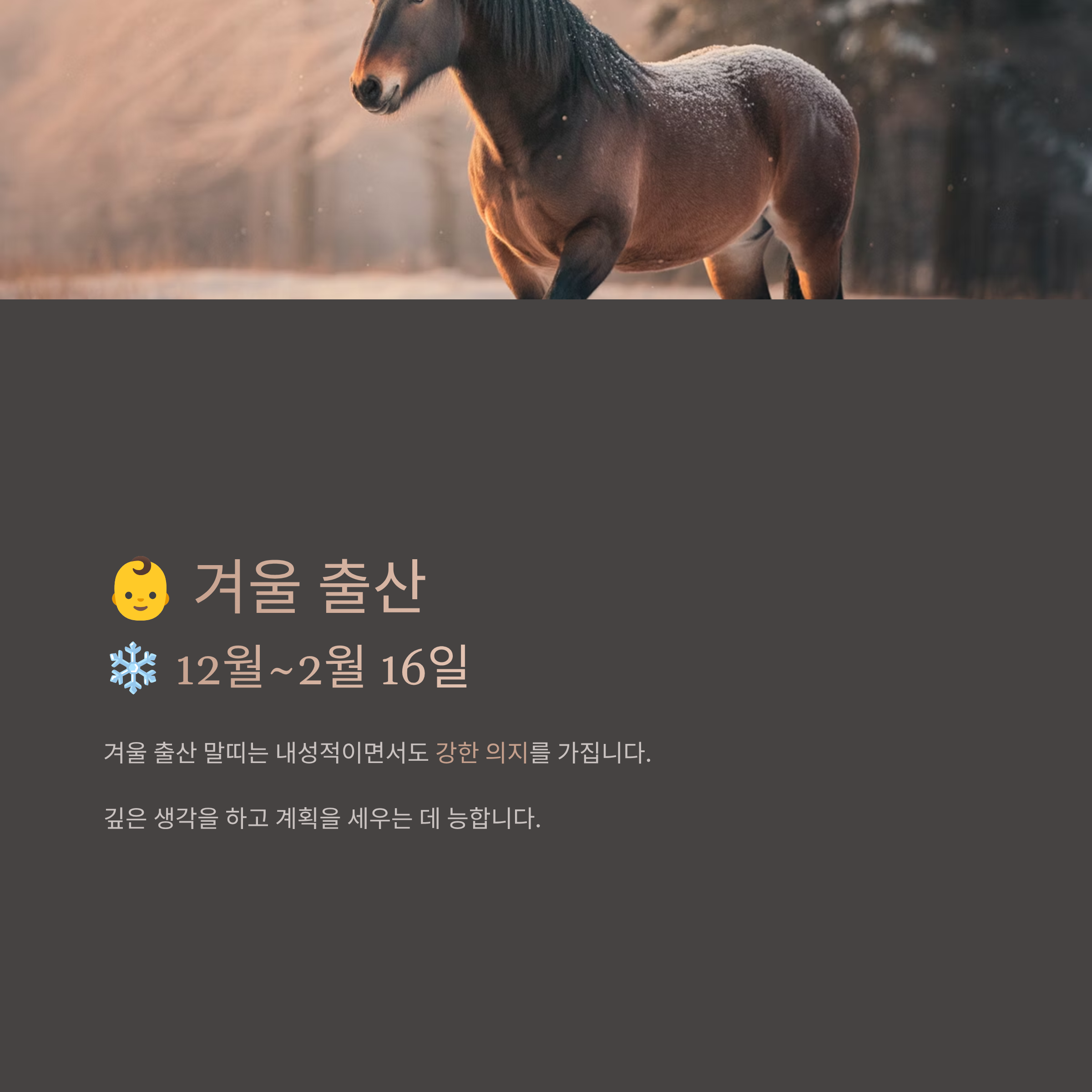 겨울 출산 말띠는 내성적이면서도 강한 의지를 가집니다. 깊은 생각을 하고 계획을 세우는 데 능합니다.