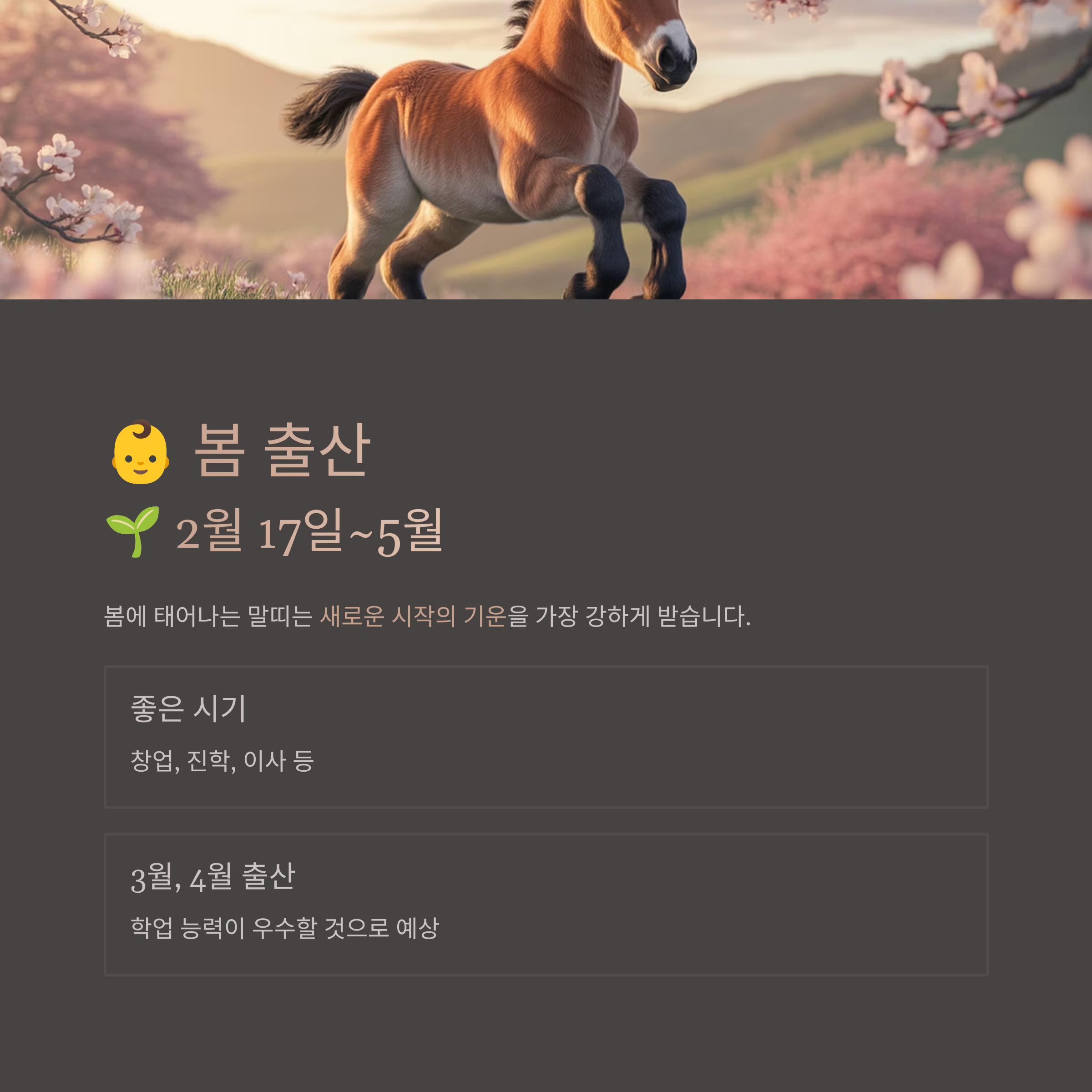 봄에 태어나는 말띠는 새로운 시작의 기운을 가장 강하게 받습니다. 창업, 진학, 이사 등에 좋은 시기입니다.