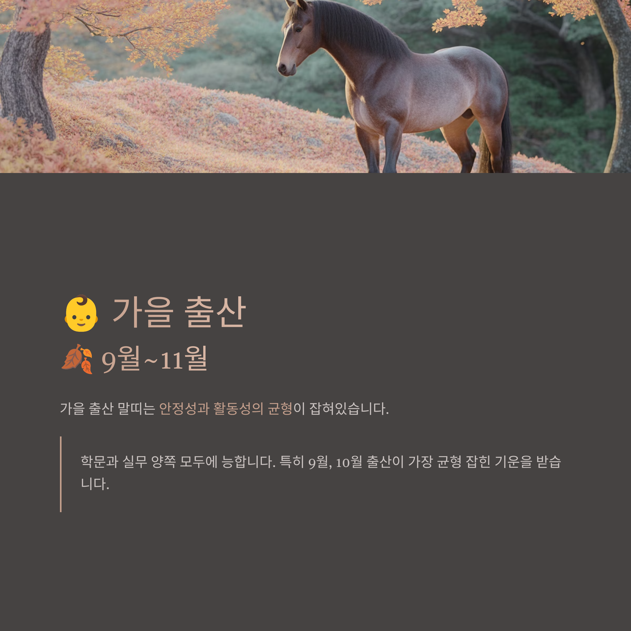 가을 출산 말띠는 안정성과 활동성의 균형이 잡혀있습니다. 학문과 실무 양쪽 모두에 능합니다.