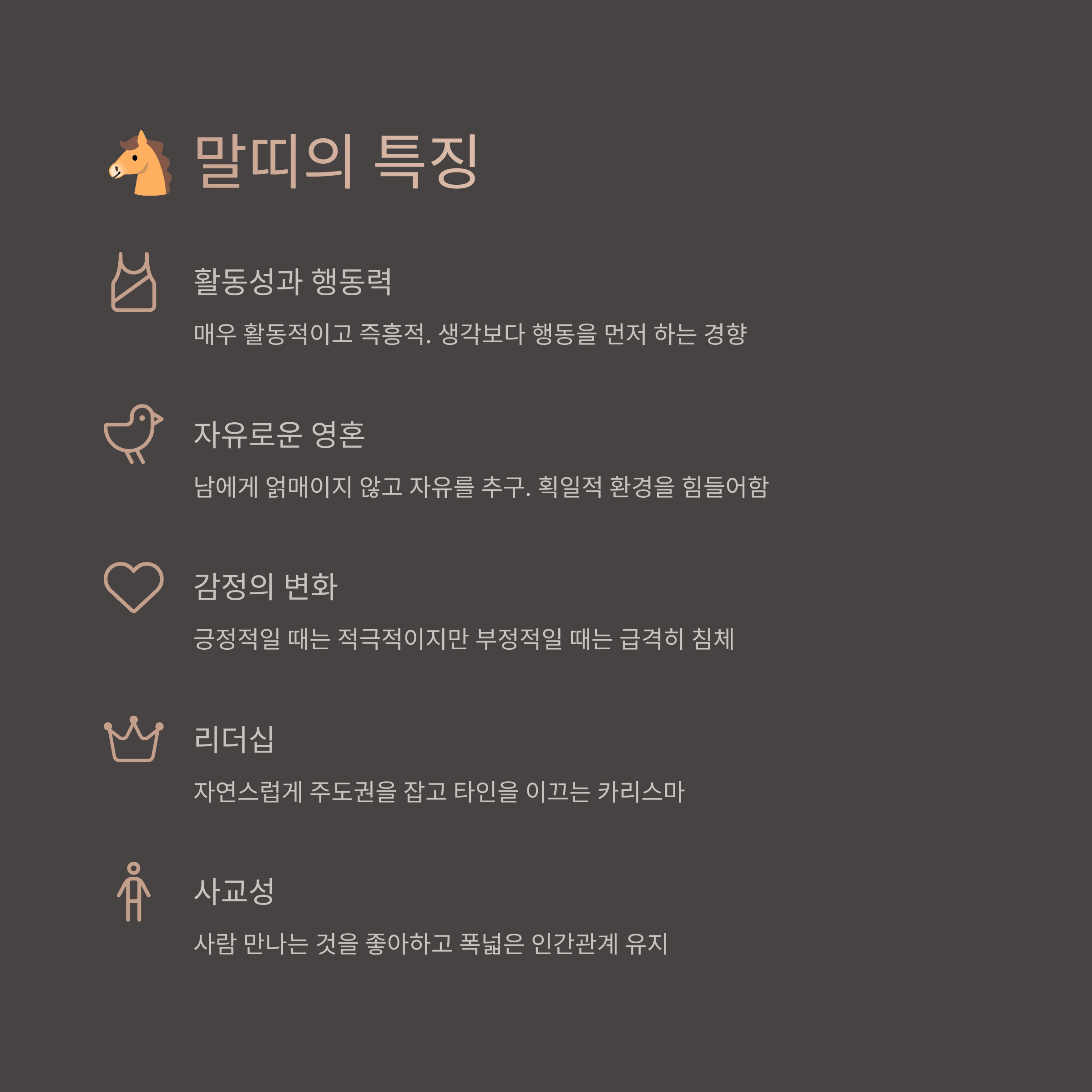 활동성과 행동력: 말띠 사람들은 매우 활동적이고 즉흥적입니다. 생각보다 행동을 먼저 하는 경향이 있습니다.