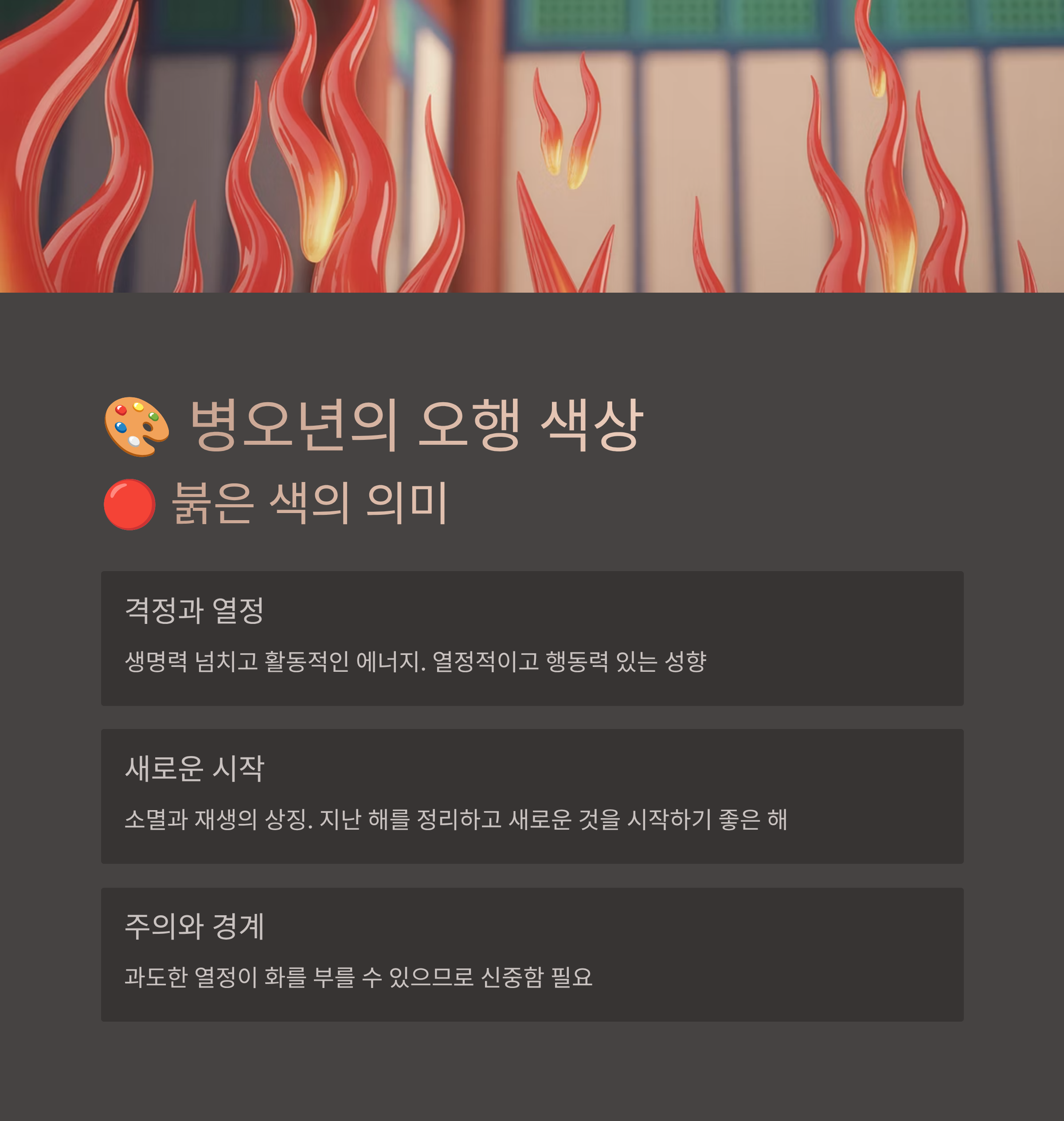 2026년 병오년의 '붉은 색'은 오행의 불(火)을 나타냅니다. 붉은 색은 다음을 상징합니다.